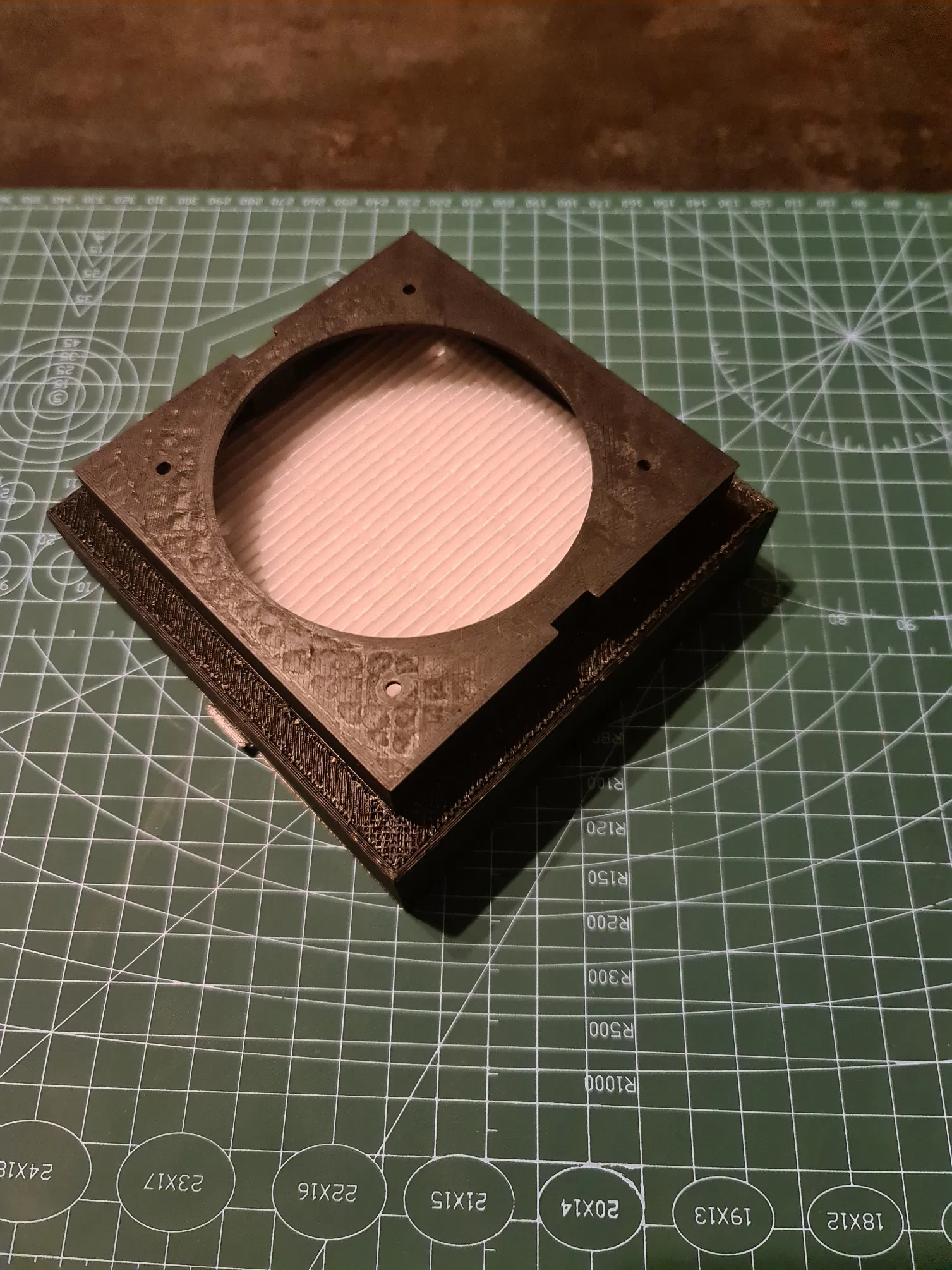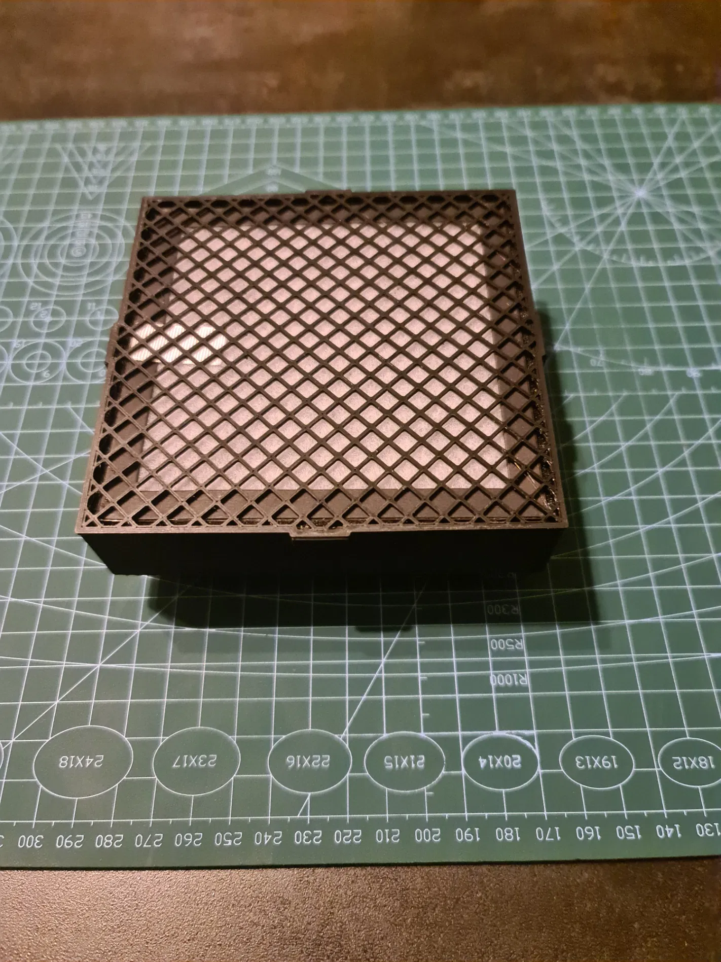Nắp được in không có phần trên/dưới, lưới lấp đầy, khoảng cách 6mm với 2 dòng.
