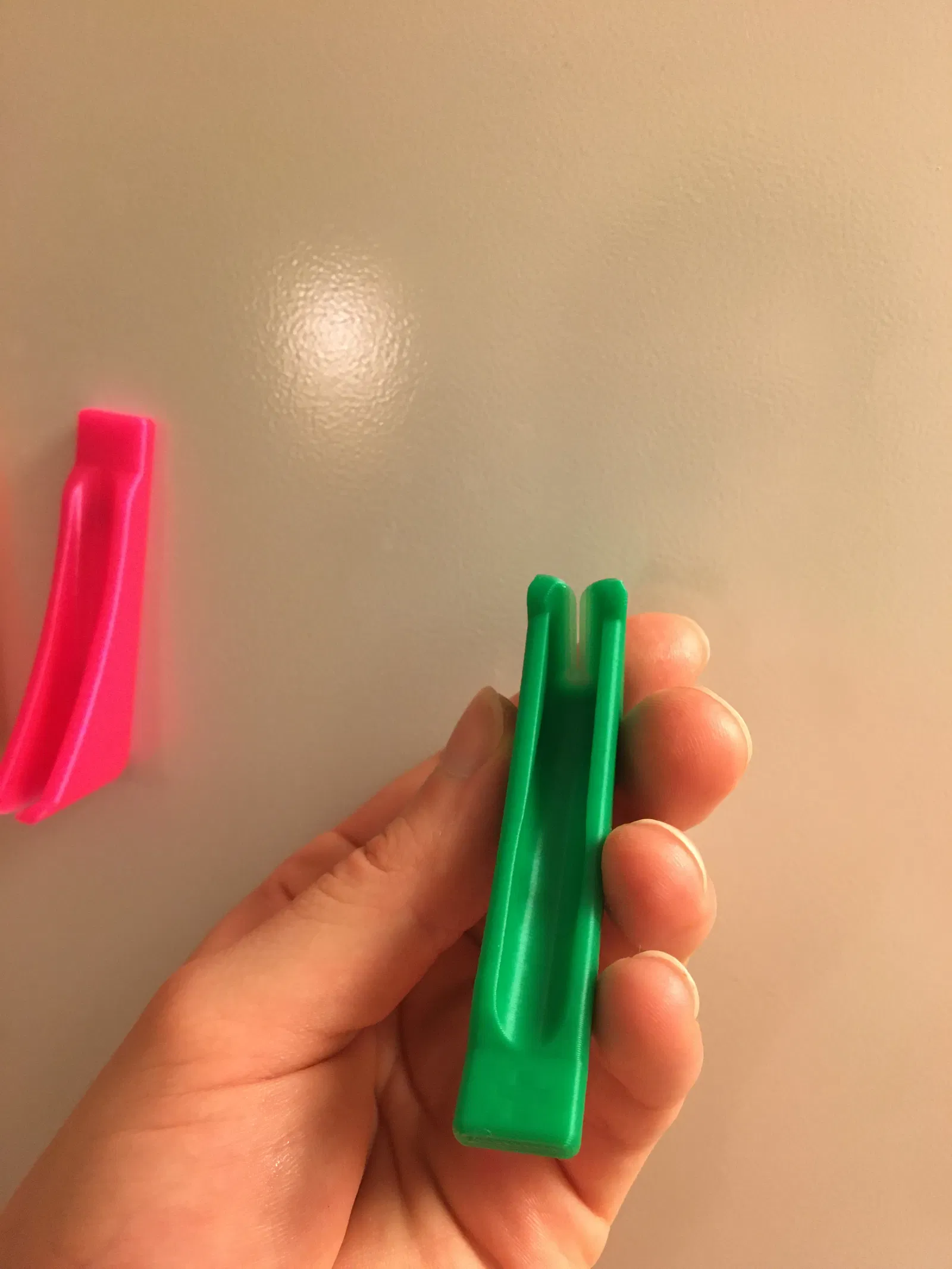 Mẹ mình có nhờ mình in mấy cái đồ gắp ve 3D á, tại con mèo nhà bả bị ve hoài mà bả cứ hay làm mất mấy cái đồ gắp ve mua sẵn hoài. Mình nghĩ bụng làm cái thiết kế sao cho nó đỡ mất hơn. Cái này mình gắn dính trên tủ lạnh bằng 2 cục nam châm Neodymium tròn 6x2mm.