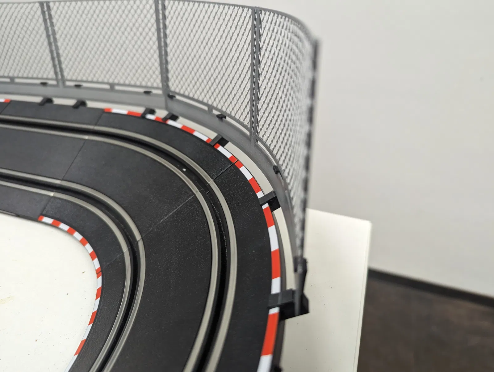 Tui dành nhiều thời gian để tìm một giải pháp đẹp cho mấy khúc cua gấp mà không cần gắn cố định. Tui tìm thấy cái rào chắn an toàn này và chỉnh sửa lại cho phù hợp với tỉ lệ và mấy cái kẹp của tui. Tui đã sửa đổi mấy cái kẹp để có thể dùng được ở mấy khúc cua gấp. Cái rào chắn này có thể tải về dưới dạng một hoặc hai mảnh ghép. Mấy tấm hình là tui xài cái loại hai mảnh ghép đó nha.