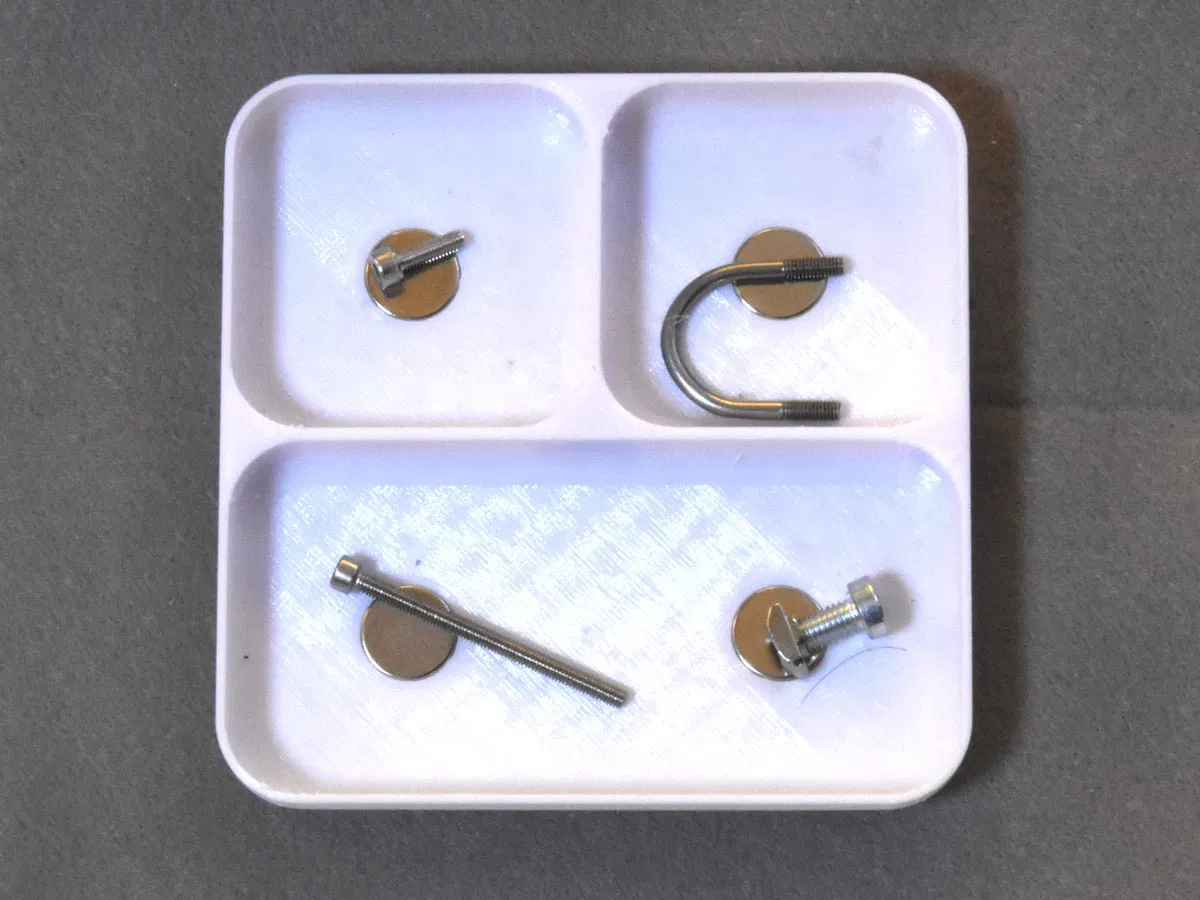 Cần chỗ để đồ nhỏ lúc sửa máy Prusa? Khay đựng linh kiện nam châm này là giải pháp! Kích thước 100x100x15mm, nam châm Neodymium giữ đồ không rớt và hút dính khay vào mâm thép. Dùng sợi PETG, in không cần support.