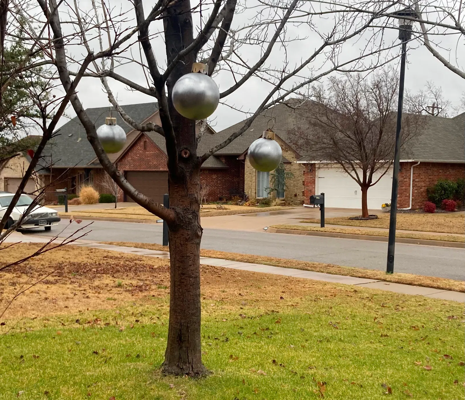 Cái này sẽ giúp bạn nhanh chóng tạo ra món đồ trang trí cho trái châu Giáng Sinh khổng lồ để treo ở cây thông ngoài trời. Nếu bạn có một trái banh nhựa bơm hơi có đường kính khoảng 10-18 inch, hãy sơn nó với sơn kim loại, và in phần chóp. Bây giờ bạn đã có một món đồ trang trí cho mùa lễ hội rồi.