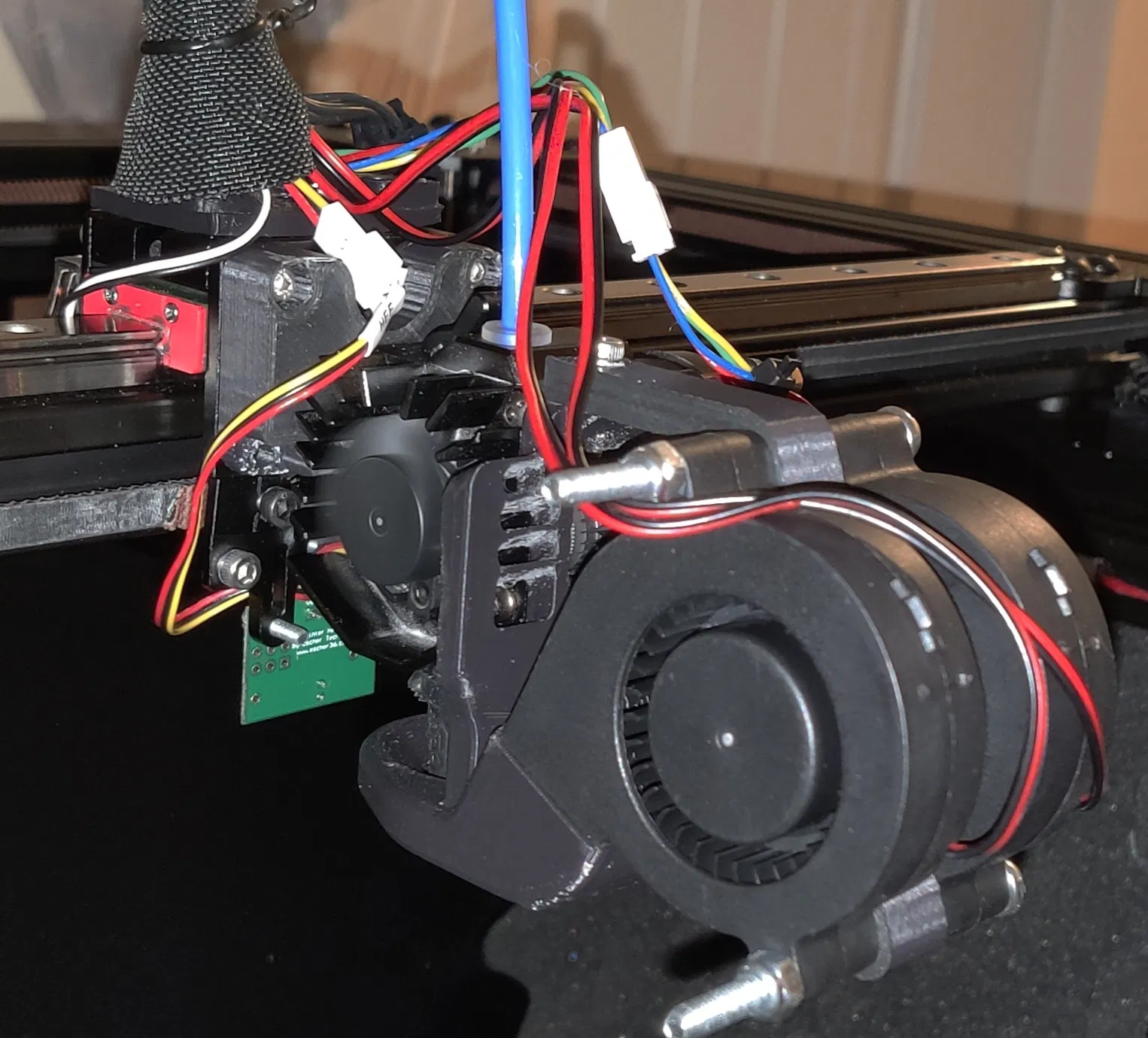 Cái bộ đôi 5015 có lưu lượng gió tuyệt vời nhưng hơi nặng phía trước. Do thiết kế BLV cube KHÔNG có vỏ bao, nên không bị giảm hành trình. Quạt 5015 rẻ và có nhiều loại cấu hình. Thiết kế dễ gắn hơn nhưng che mất lối vào bánh răng thứ hai của orbiter. Điều này không thành vấn đề trừ khi bạn cần lấy nó ra để thông kẹt TPU. Lưu lượng gió của quạt 5015 mạnh hơn nhiều. Mỗi quạt có lưu lượng gió cao hơn, theo tôi, so với quạt 7530 tôi có, nhưng kết quả có thể khác nhau tùy người dùng. Tôi đấu dây từng quạt riêng lẻ vào duet 2 Wifi bằng Klipper, nên chỉ cần đặt multipins thành fan0 và fan1 để chúng hoạt động cùng nhau khi được điều khiển như quạt tản nhiệt.