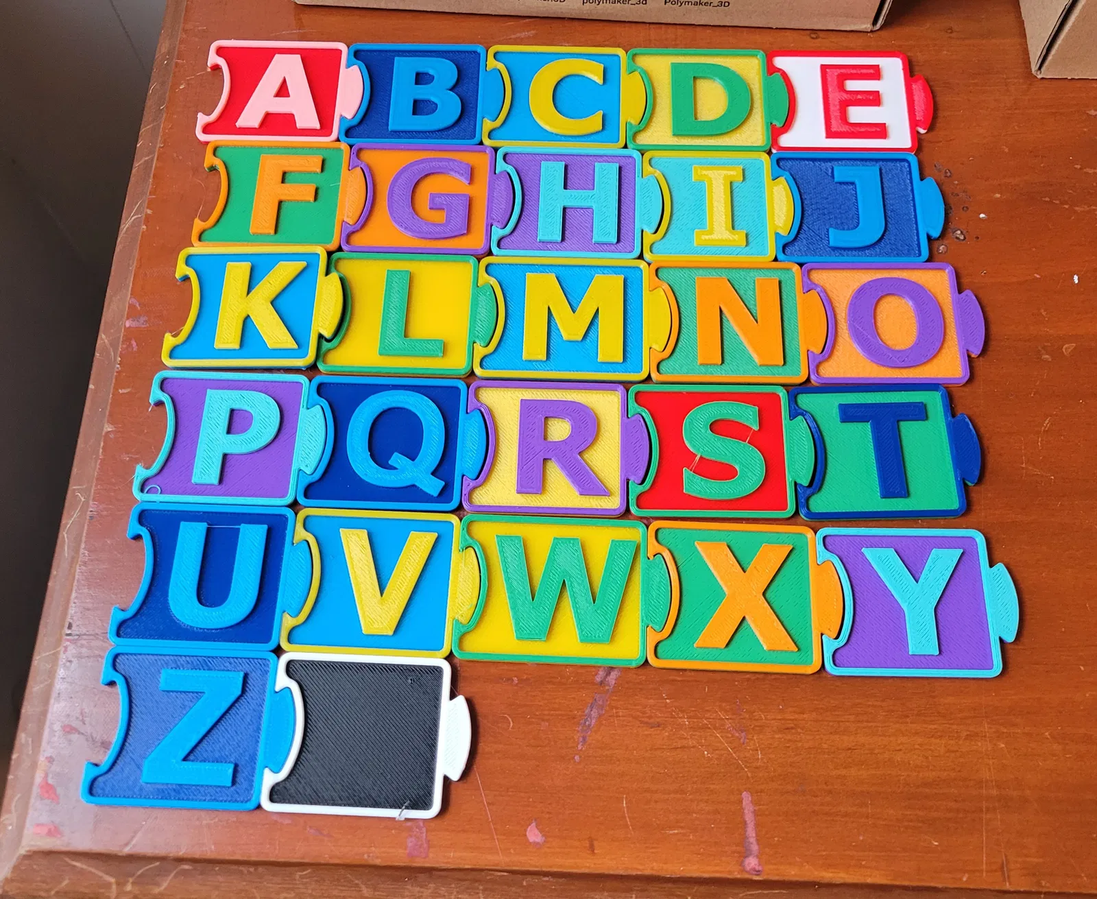 Bộ chữ cái rời, cao khoảng 1.75 inch, có khớp ghép hình để anh em có thể nối lại thành từ. In đơn giản, không cần support, cực kỳ tiện lợi cho việc dạy bé đánh vần hoặc làm đồ trang trí.