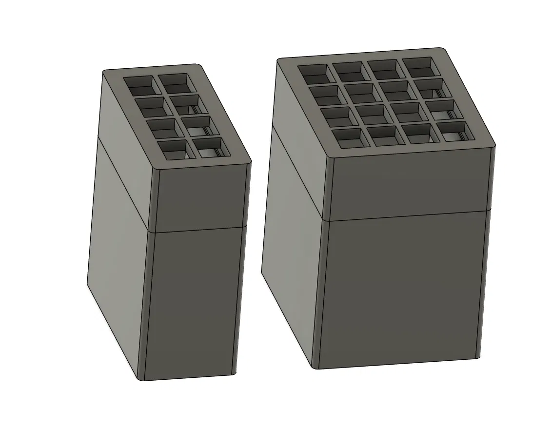 Tui cố gắng tạo mẫu này cho giống với hình dáng của cây bút dạ quang. Các khe cắm có kích thước 10mm x 13mm và có thể dùng được cho các loại bút và bút dạ quang khác. Tui làm nó thành 2 phần để có thể in được mà không cần đến support.