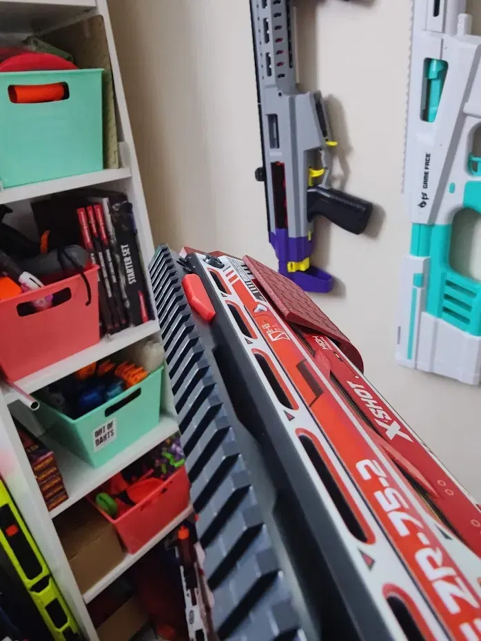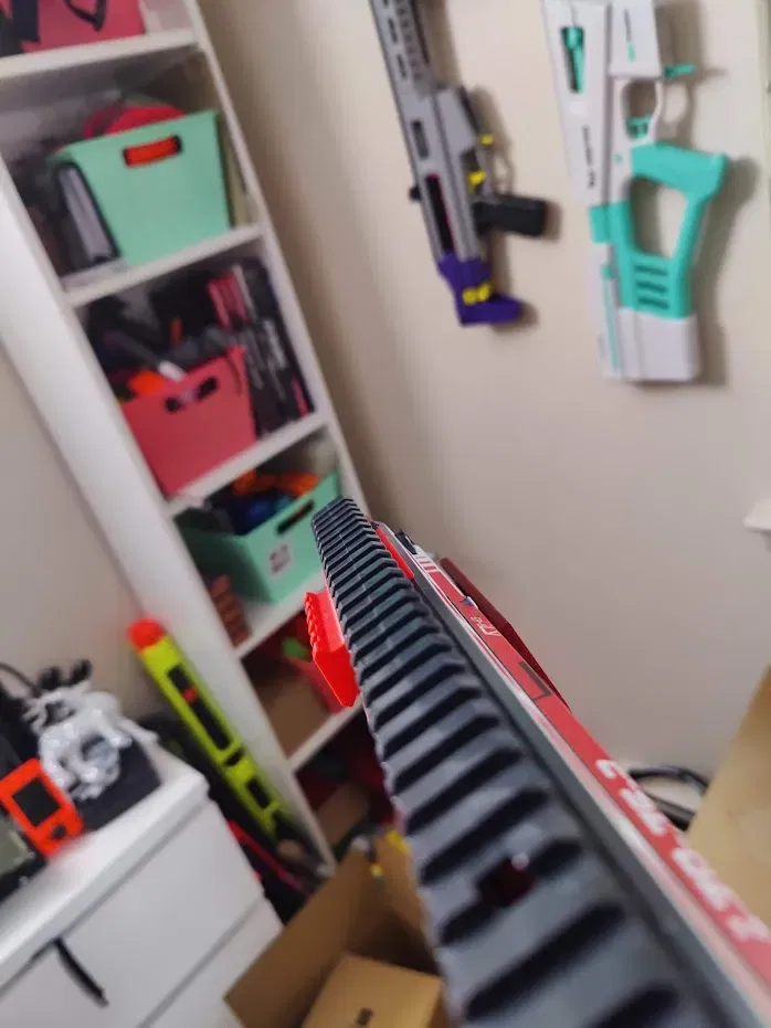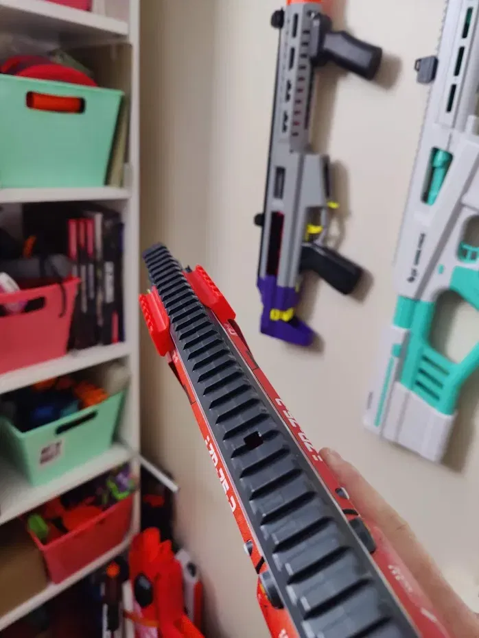 Thiết kế này được làm để nhét vừa vào các khe hình thang trên thanh ray của Xshot Longshot. Cái này xài 2 con ốc đồ chơi (mấy con ốc thường mà Nerf, Dartzone, với Xshot xài để ráp mấy khẩu blaster lại với nhau). Có nhiều lựa chọn cho cái này lắm, tại cái góc bạn muốn nó có thể khác tùy theo đồ bạn định gắn lên.
