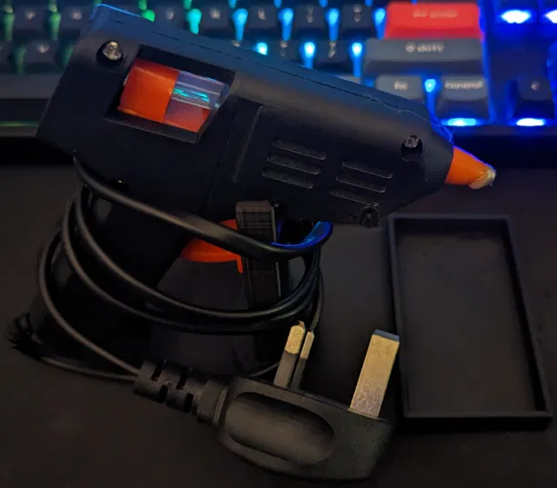 Có khay hứng để hứng keo bị rớt ra. Phần bo tròn để giữ súng bắn keo nhìn có vẻ không "vừa khít"; điều này là cố ý và cho phép súng bắn keo xoay nhẹ một chút do dây cáp, v.v.