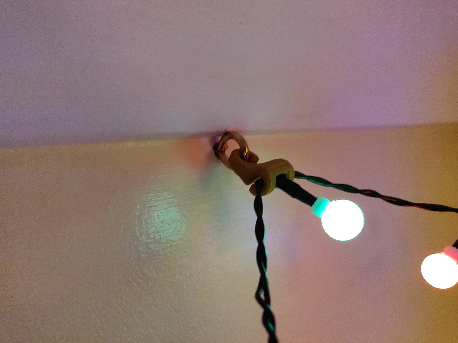 Cái móc này dùng để luồn qua dây đèn Giáng Sinh, với dây cáp khoảng 2mm và vòng treo tường 8mm. Thiết kế vừa khít giúp giữ dây đèn gọn gàng khi cất giữ.
