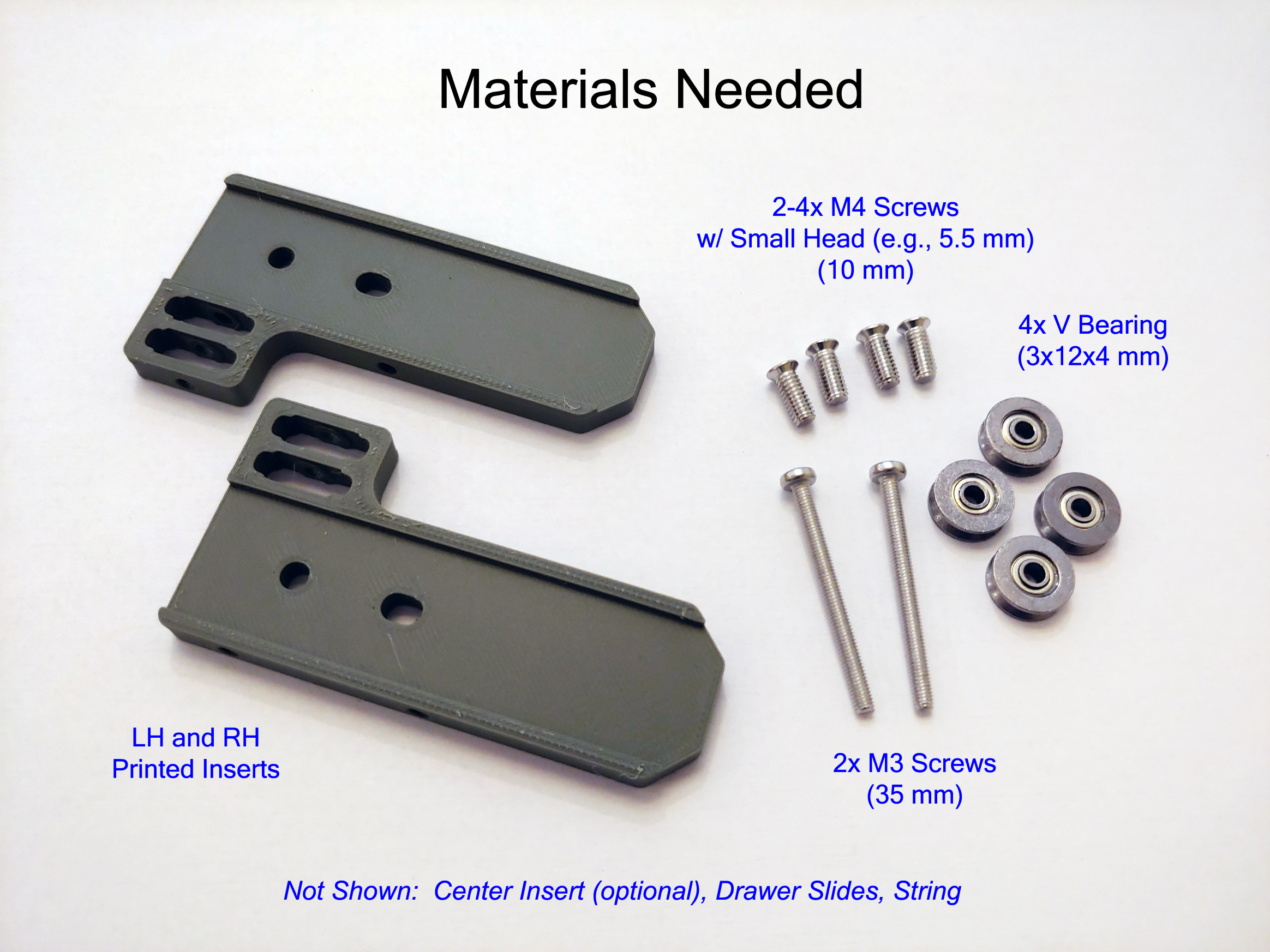 Ngoài các bộ phận in 3D, ray ngăn kéo và dây (thường là dây UHMWPE hoặc dây câu), phần cứng sau đây là cần thiết cho mỗi bộ chèn: