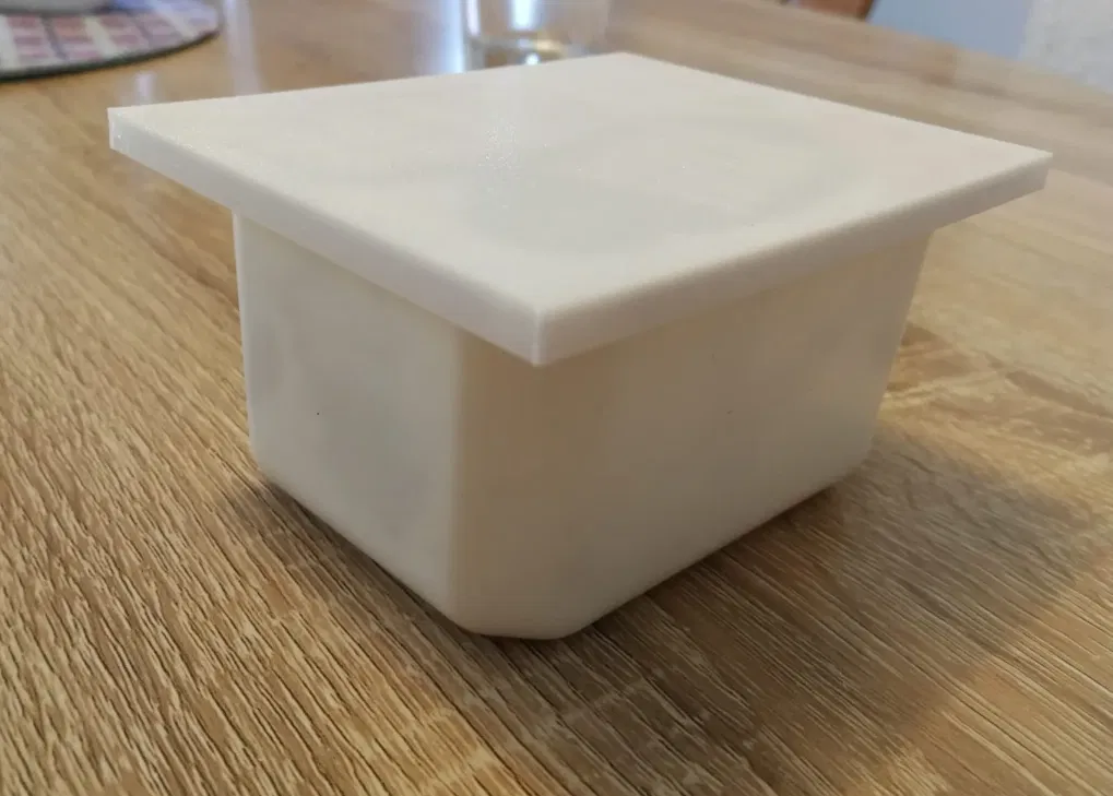 Sữa chua của tui hay bị hư vì không có nắp đậy đúng cách. Tui đã thiết kế một cái nắp trượt đơn giản. Nếu cái này không vừa, bạn có thể ghé xem ở đây (phiên bản mới hơn): Thời gian in khoảng một tiếng Tiêu thụ vật liệu: khoảng 4.2m Vật liệu: PLA Trắng Nhiệt độ in: 200°C Nhiệt độ bàn in: 60°C Chiều cao lớp: 0.2mm Tốc độ in: 60mm/s Tốc độ thành vách: 30mm/s Support: có/không (không cần thiết, nhưng có thể không vừa nếu in không có support. Tuy nhiên, support có thể khó gỡ bỏ...) Cài đặt Support: Mật độ: 15%, Lines, Khoảng cách X/Y: 0.2mm