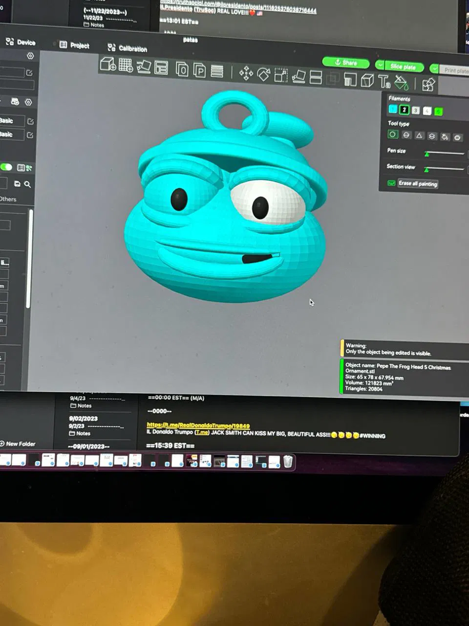 Có 2 mẫu đồ trang trí Giáng sinh Pepe Ếch, một mẫu miệng mở và một mẫu liền. Cả hai đều tuyệt vời! In bằng raft, tree supports, 2mm layer height. Hãy in và lan tỏa Pepe đi khắp nơi!