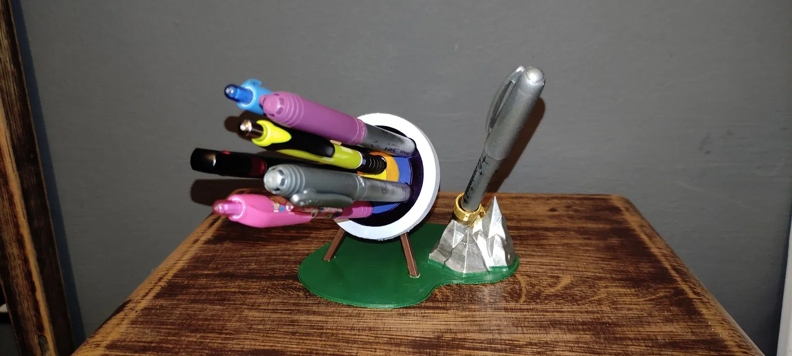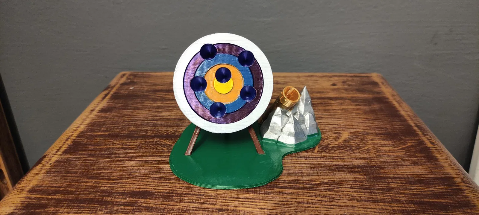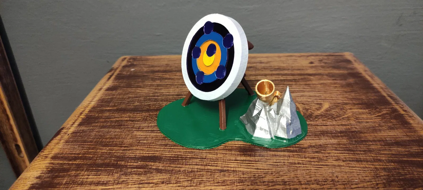Ban đầu tui chỉ in cái bia thôi, mà cái bia nó bị xê dịch (rơi xuống), nên tui chế thêm cái đế để dán bia lên. Trên đế còn có cái ống đựng tên (quiver) tựa trên phiến đá, ống này có thể cắm thêm cây viết.