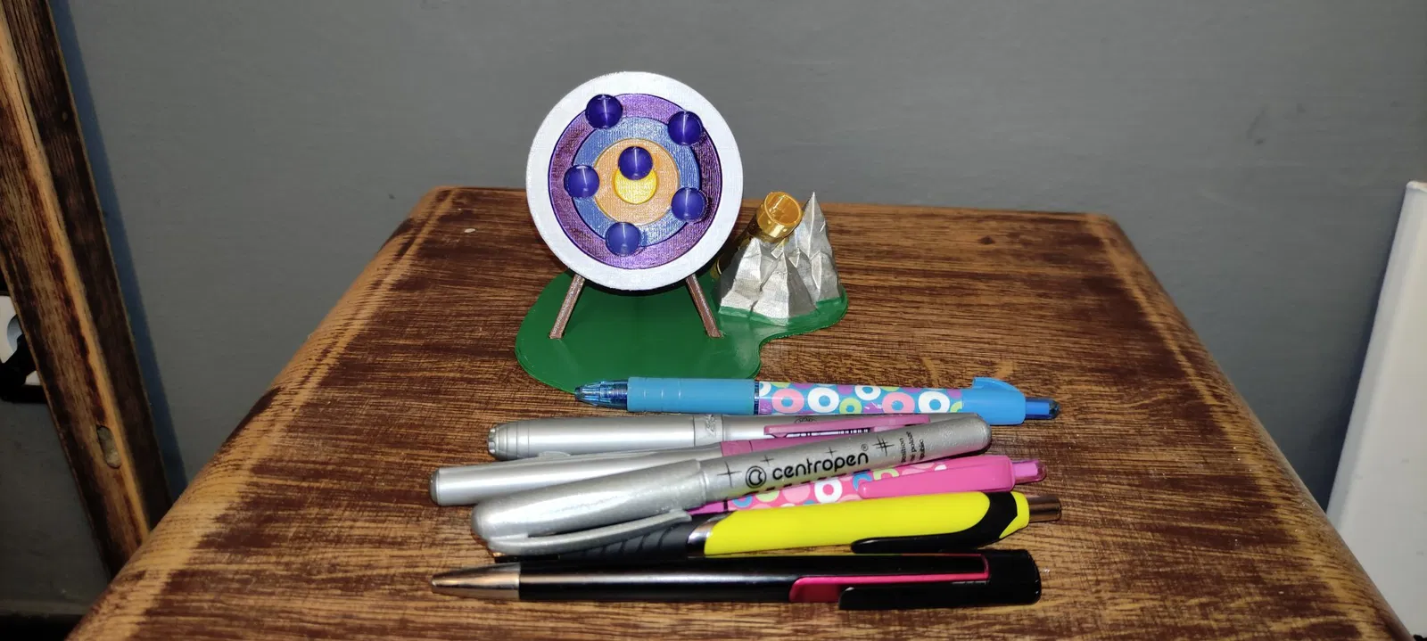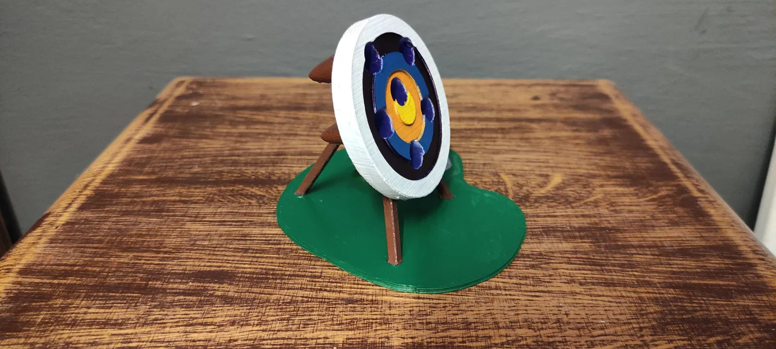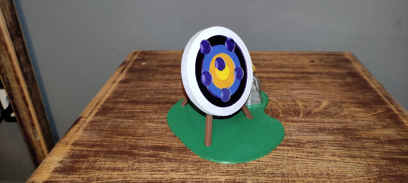 Ban đầu tui chỉ in cái bia thôi, mà cái bia nó bị xê dịch (rơi xuống), nên tui chế thêm cái đế để dán bia lên. Trên đế còn có cái ống đựng tên (quiver) tựa trên phiến đá, ống này có thể cắm thêm cây viết.