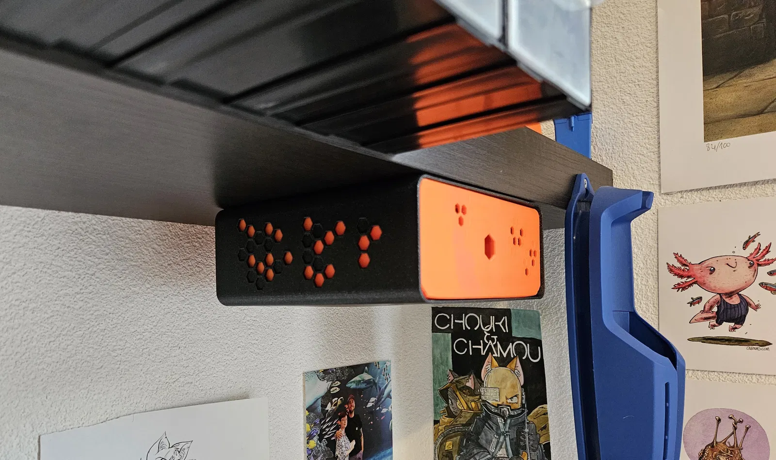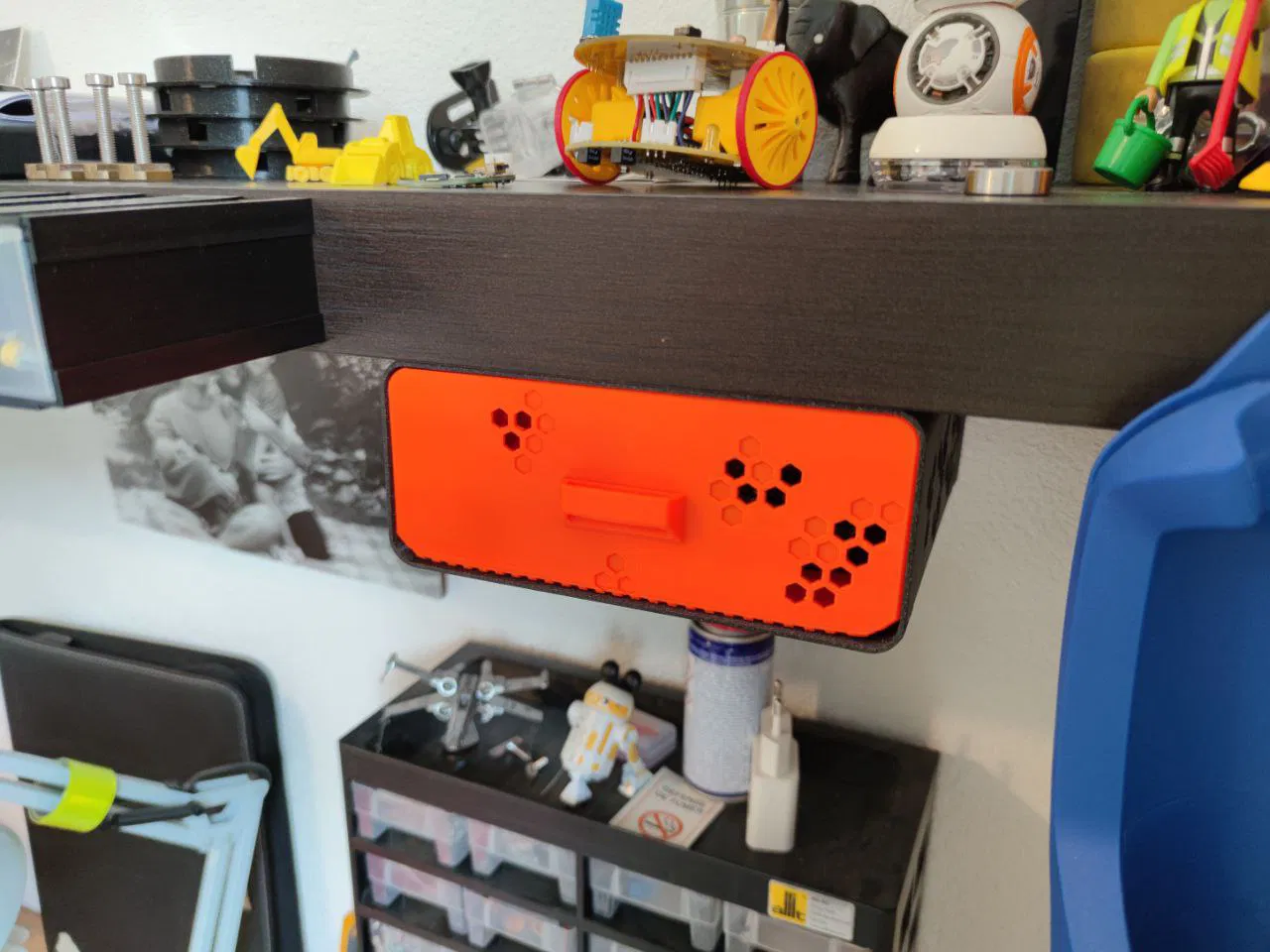 Hộp ngăn kéo đơn giản, có thể gắn dưới bàn hoặc kệ tủ. Có phiên bản có/không tay cầm, kích thước thường/lớn. Hỗ trợ in trên Mk4/Mk3 và Mini, sử dụng tính năng lớp đầu tiên dạng tổ ong của PrusaSlicer để tăng độ bám dính.