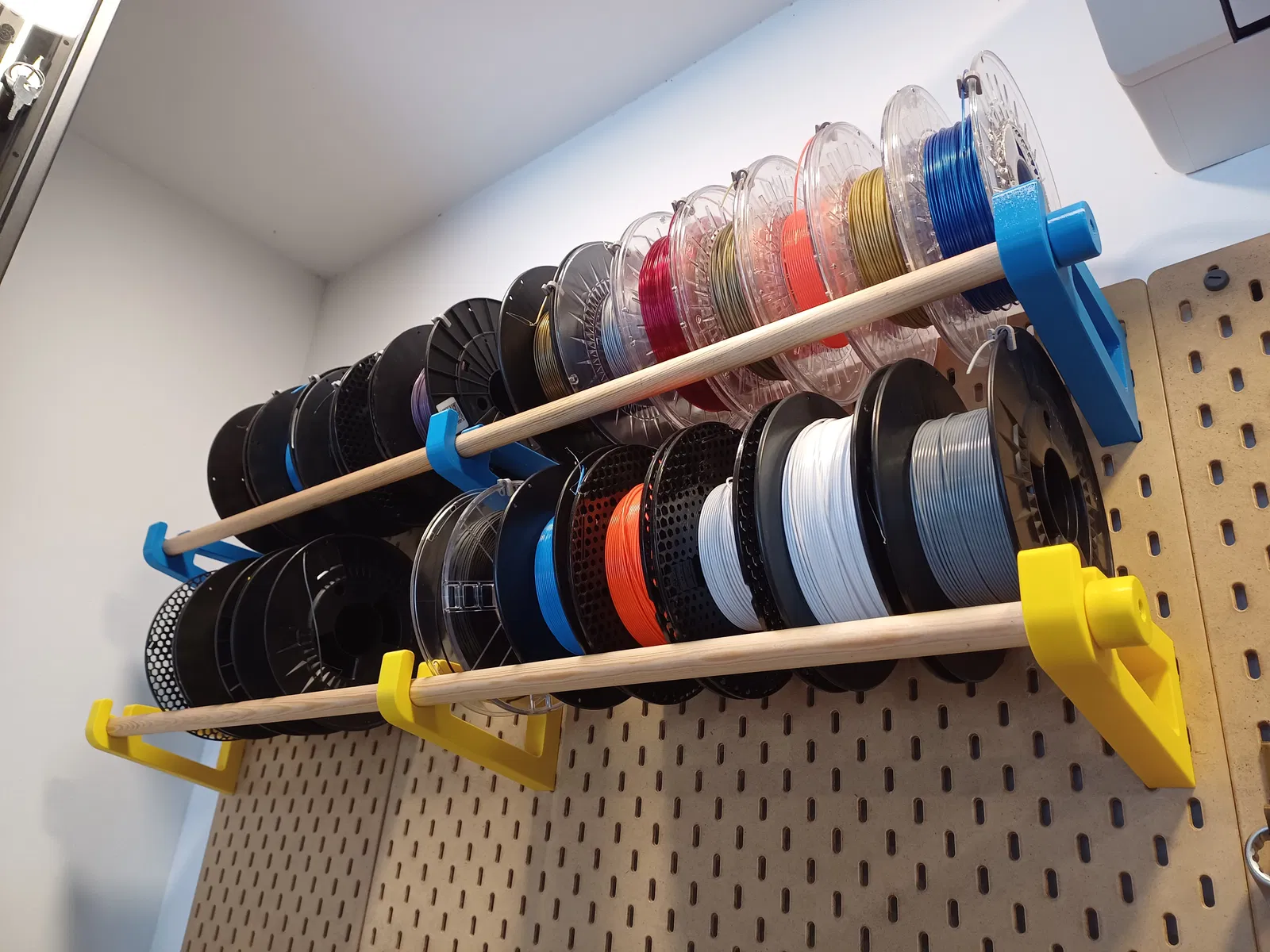 Tôi đã thử vài giải pháp giá đỡ spool cho Skadis nhưng không hài lòng, tôi cần cái gì đó đơn giản và quyết định tự làm. Tôi có các bảng 76 cm và 36 cm gắn cạnh nhau nên cần ít nhất ba giá đỡ để chịu được sức nặng.