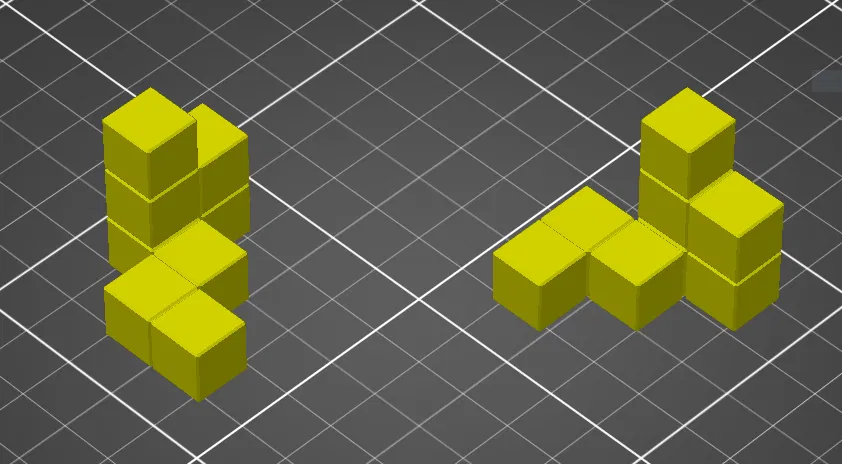Cái xếp hình này có hai mảnh giống hệt nhau, mỗi mảnh gồm tám khối lập phương. Ghép chúng lại để tạo thành một hình có đối xứng gương.