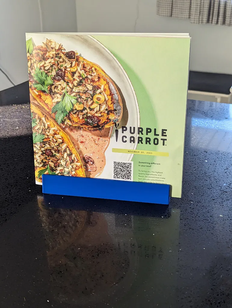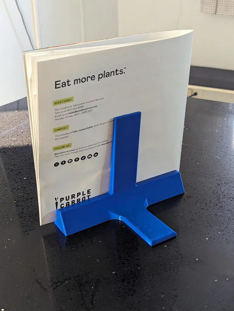 Giá đỡ này dành cho sách công thức nấu ăn Purple Carrot. Không còn phải dựa sách vào hũ muối hay thớt nữa! Phiên bản này được chỉnh sửa để có khe rộng hơn, phù hợp với sách dày hơn.