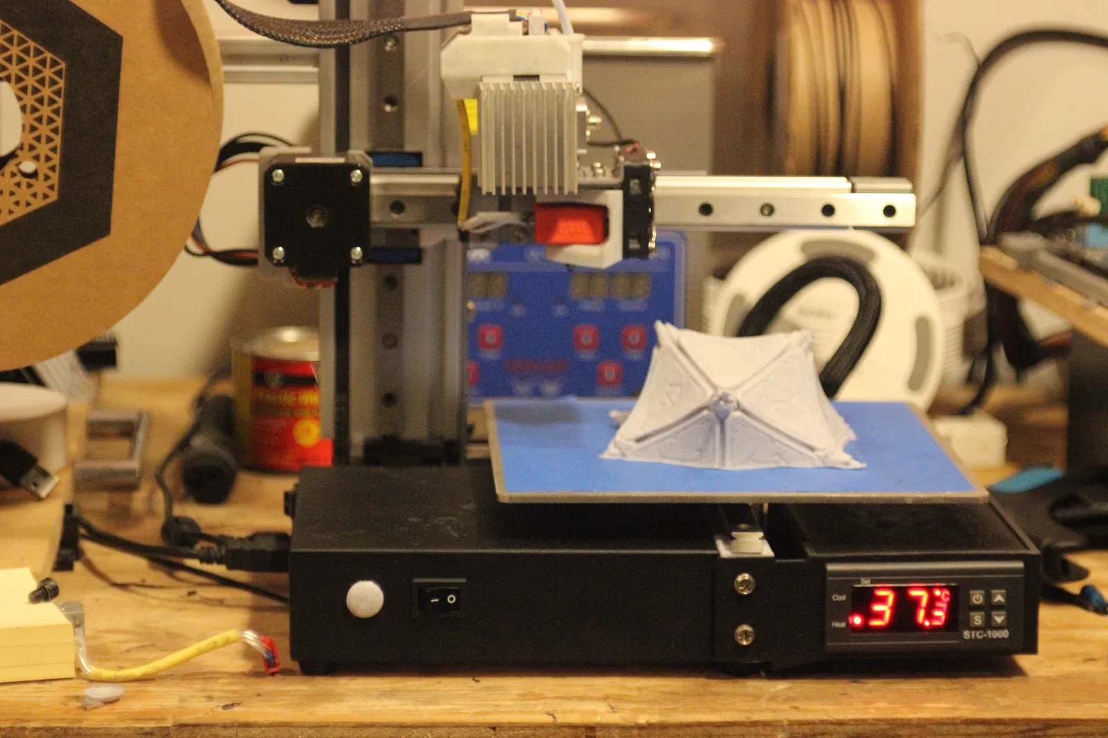 Mới đây, mình đã nâng cấp bàn nhiệt nóng cho máy Cetus, bạn có thể xem chi tiết ở đây trên instructables nha; https://www.instructables.com/DIY-Heated-Bed-for-the-Tiertime-Cetus-3D-Printer/ và mình cần một giải pháp để gắn cái bộ điều khiển nhiệt STC1000 đã chọn lên máy một cách gọn gàng, chuyên nghiệp. Mình quyết định gắn nó ở cạnh trục Y với các cánh gá phù hợp với lỗ bu lông bên dưới máy in.