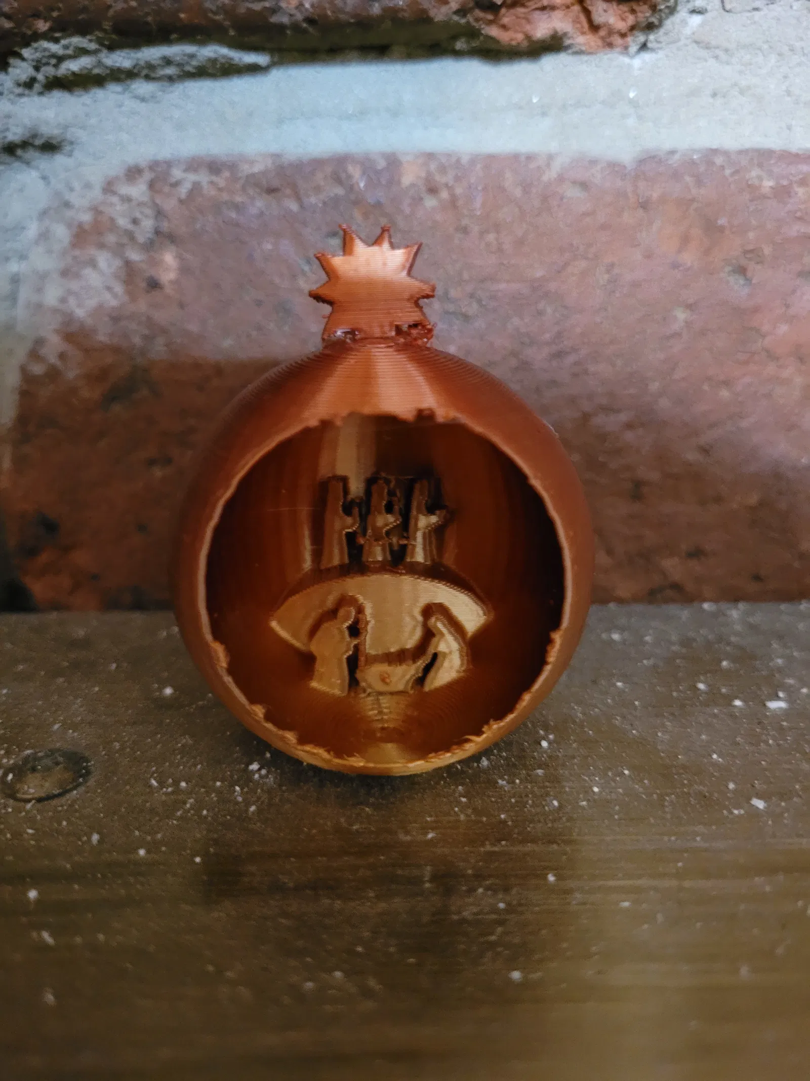 Mô hình quả cầu 3D cảnh Chúa giáng sinh nhỏ nhắn, thích hợp đặt trên lò sưởi. Hoàn hảo cho mùa Giáng sinh, mang ý nghĩa thiêng liêng và là điểm nhấn ấm áp cho không gian nhà bạn. In bằng PLA với hỗ trợ cây.