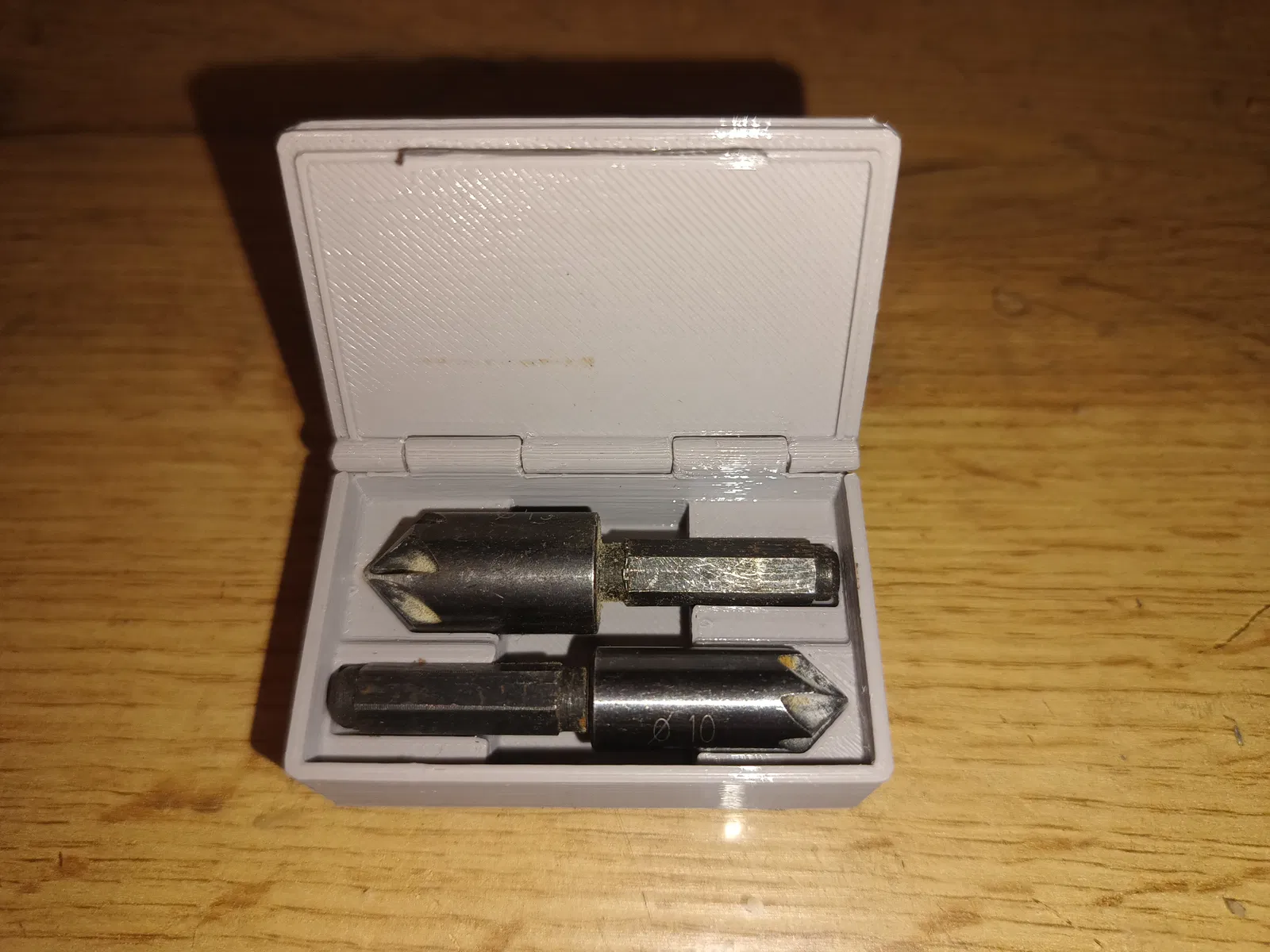 Hộp đựng mũi khoét lỗ 10mm và 13mm, tiện lợi cho việc lưu trữ và mang theo. Thiết kế đơn giản, sử dụng vật liệu in 3D bền bỉ. Chốt bản lề được tích hợp, bạn chỉ cần dùng sợi nhựa (filament) để lắp ráp.