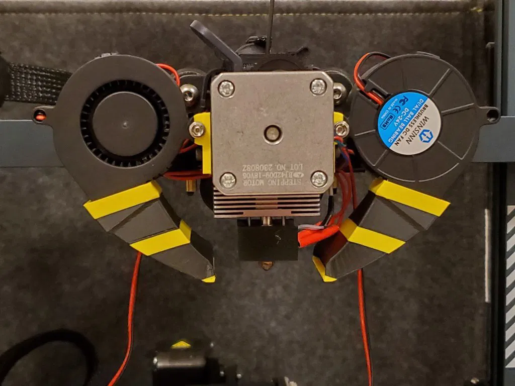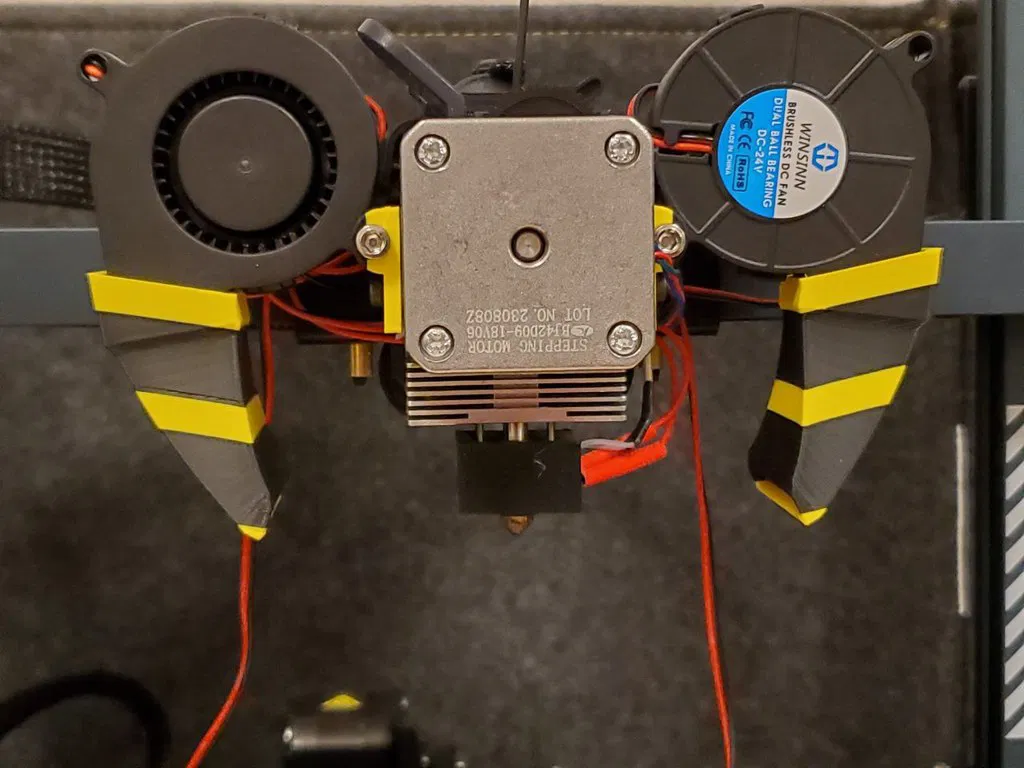 Tôi đã thiết kế giá đỡ bên hông để cho phép điều chỉnh theo chiều dọc nhằm kiểm soát khoảng cách với bàn in. Tính năng thú vị chính của "răng ong" này - khả năng mở/đóng theo chiều ngang giống như hàm của côn trùng thật - giúp định hướng chính xác luồng làm mát tùy thuộc vào chiến lược in. Các ống dẫn làm thu hẹp luồng không khí từ quạt 5015 và đồng thời làm cho nó rộng hơn, vì vậy sức mạnh của luồng khí không bị lãng phí mà vẫn tiếp tục làm mát các bộ phận sau khi đầu phun di chuyển đi.