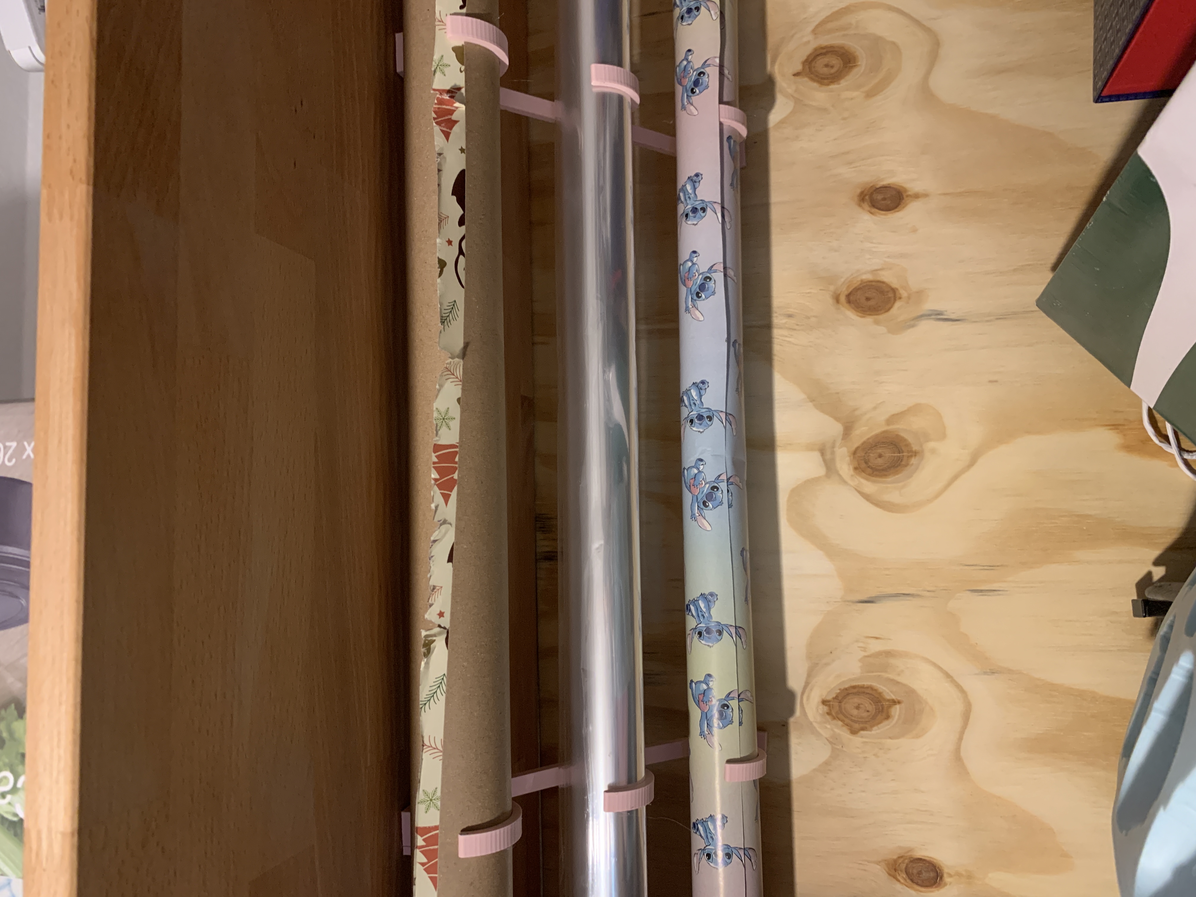 Một cách để treo giấy gói quà của bạn trong tủ quần áo. Sản phẩm này giúp bạn sắp xếp gọn gàng giấy gói quà, tiết kiệm không gian và dễ dàng tìm thấy khi cần sử dụng, giữ cho giấy luôn phẳng phiu và không bị nhăn.