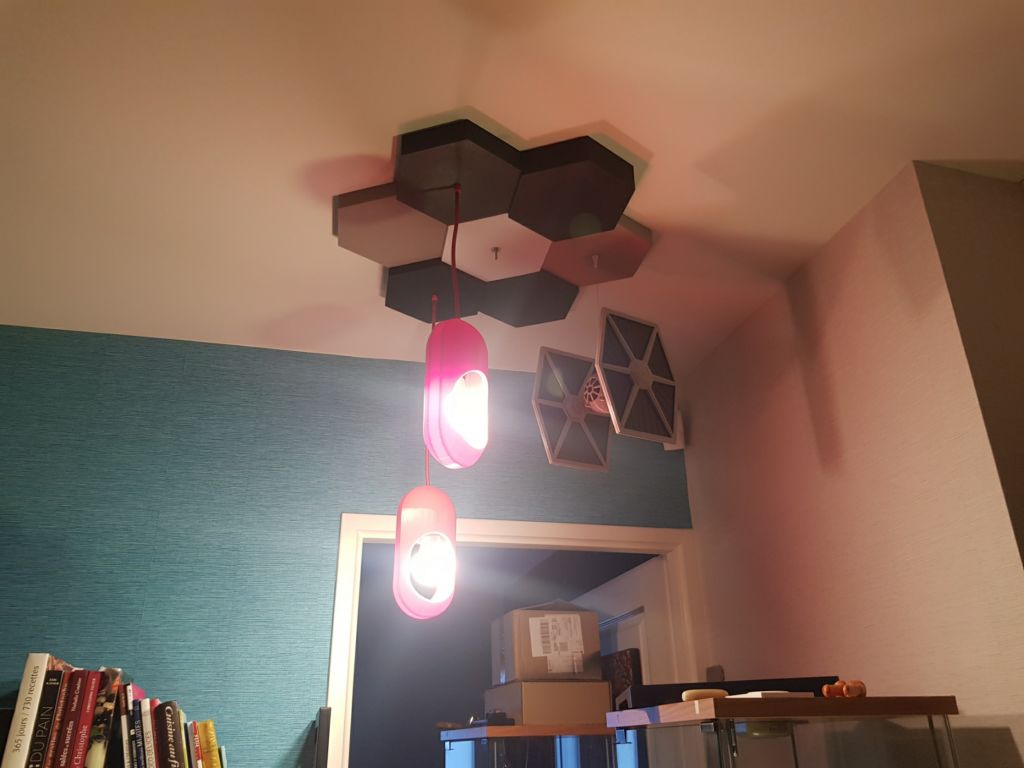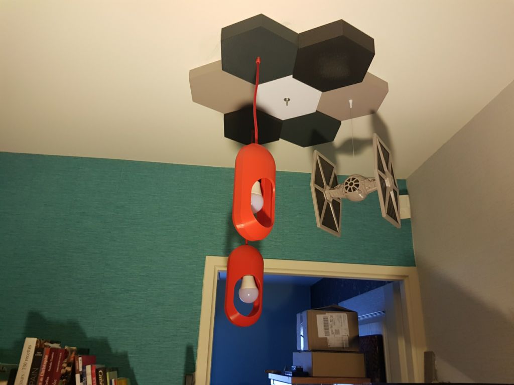 Tạo một chiếc đèn chùm độc đáo từ 7 hình lục giác, kết hợp 2 bóng đèn chiếu sáng và một mô hình TIE fighter để trang trí. Được làm từ vật liệu PTEG với chất lượng in 0.20, sản phẩm này yêu cầu giá đỡ cho phần chụp đèn và hệ thống treo phù hợp với hộp DCL âm trần.