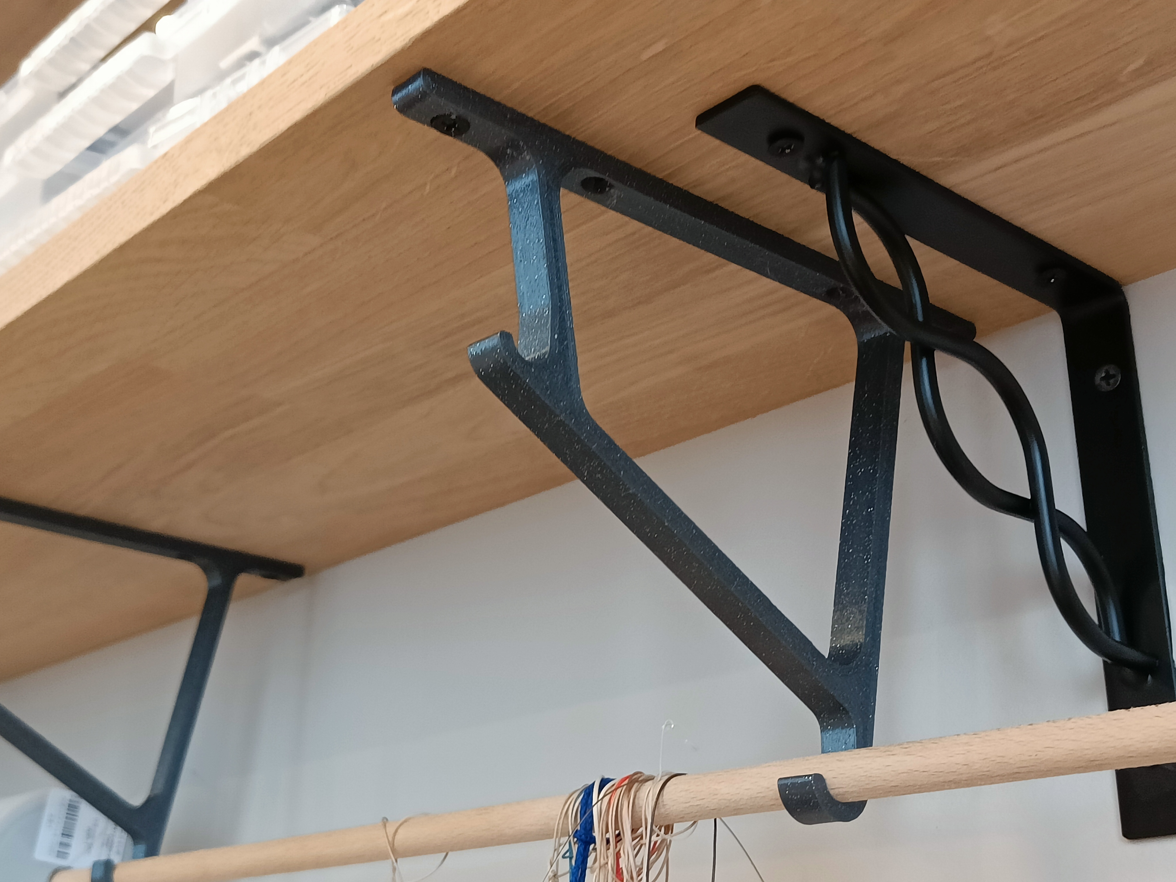 Giá đỡ thanh gài đơn giản, dễ in, gắn dưới kệ, có mô hình tùy chỉnh Onshape. Phù hợp để treo hai thanh gài cho cuộn dây và các vật dụng khác, dễ dàng tháo lắp.
