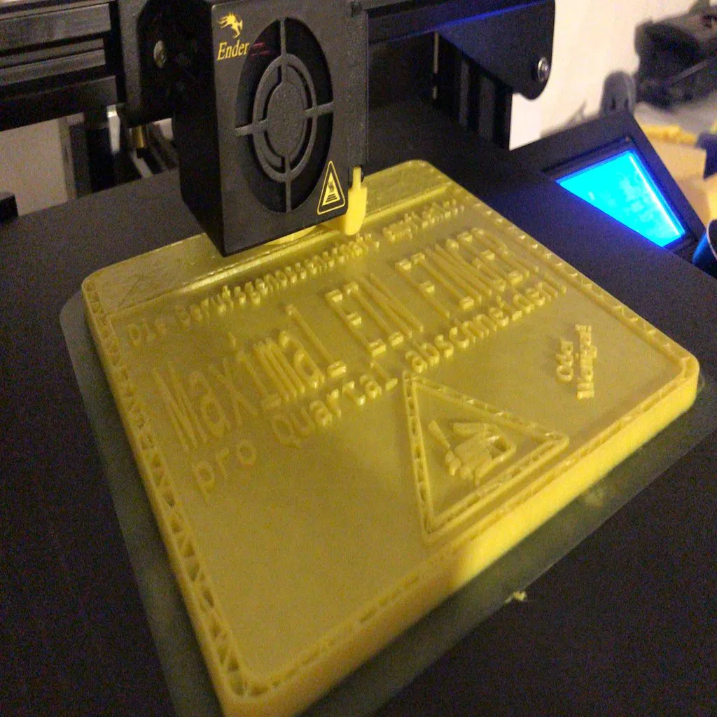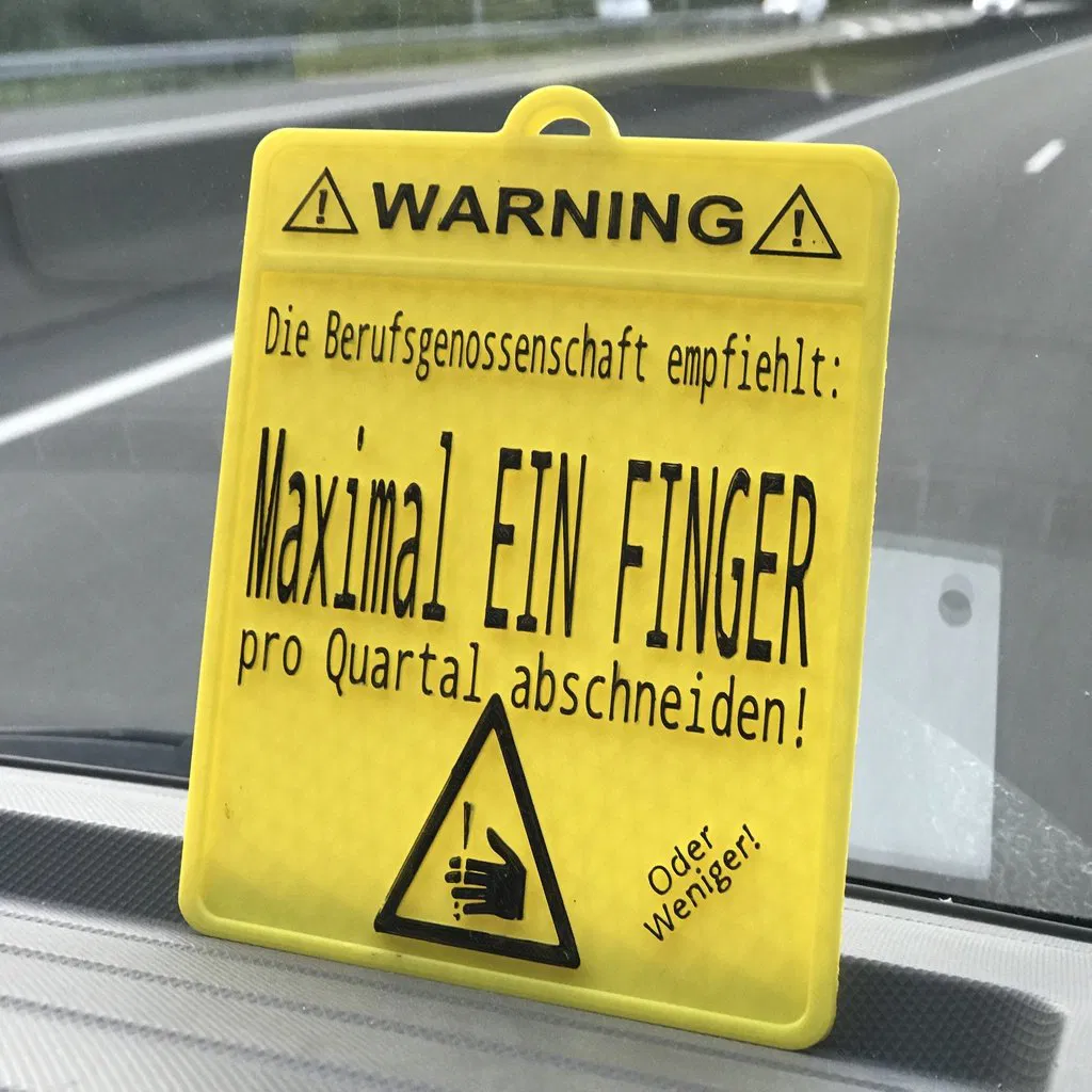 Tấm biển cảnh báo "Cắt tối đa MỘT NGÓN TAY mỗi quý!" với các chữ và logo được sơn nổi bật. Thích hợp in với máy Creality Ender 3, sử dụng nhựa PLA màu vàng, độ phân giải 0.2mm và infill 20%. Sản phẩm này thuộc danh mục Coins & Badges, rất phù hợp cho thợ mộc hoặc thợ đóng tàu.