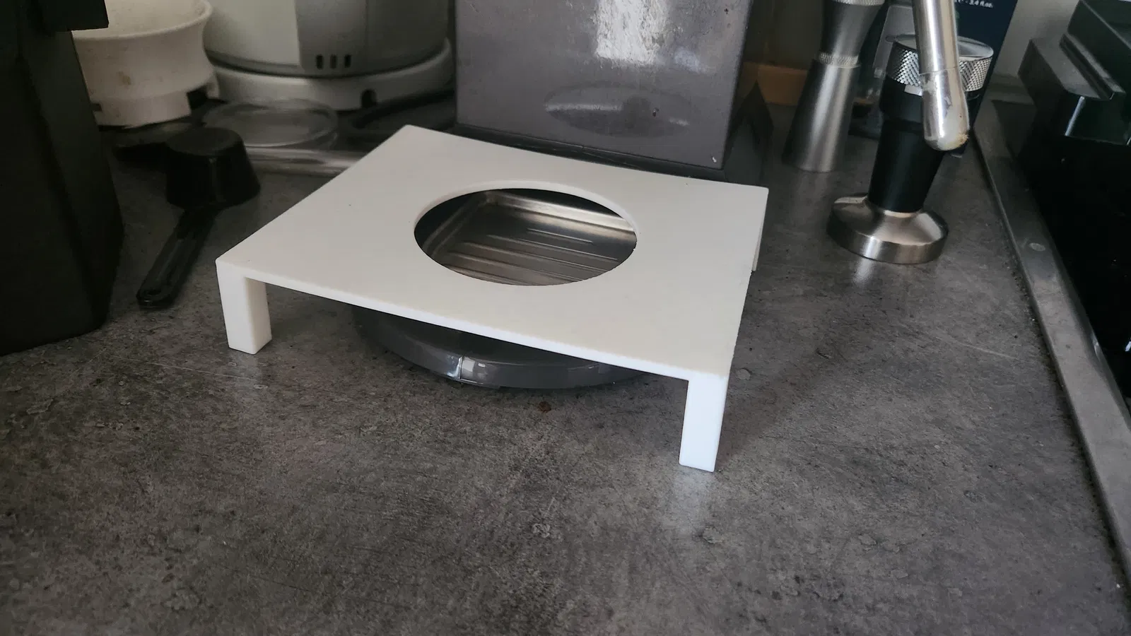 Mẫu chân đế này yêu cầu bạn phải tháo khay nhỏ giọt của máy pha cà phê DeLonghi Dedica. Đây là phiên bản đầu tiên, người dùng sẽ tiếp tục cải tiến để cho ra mắt các phiên bản có ngoại hình bắt mắt hơn.