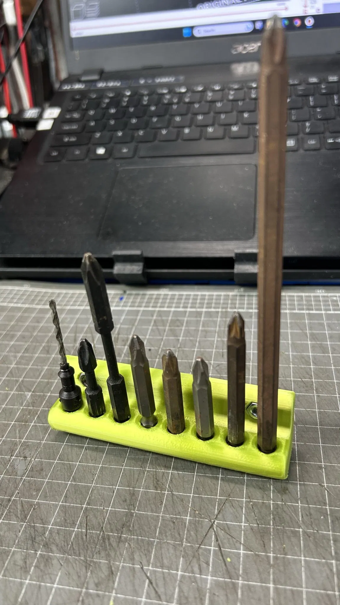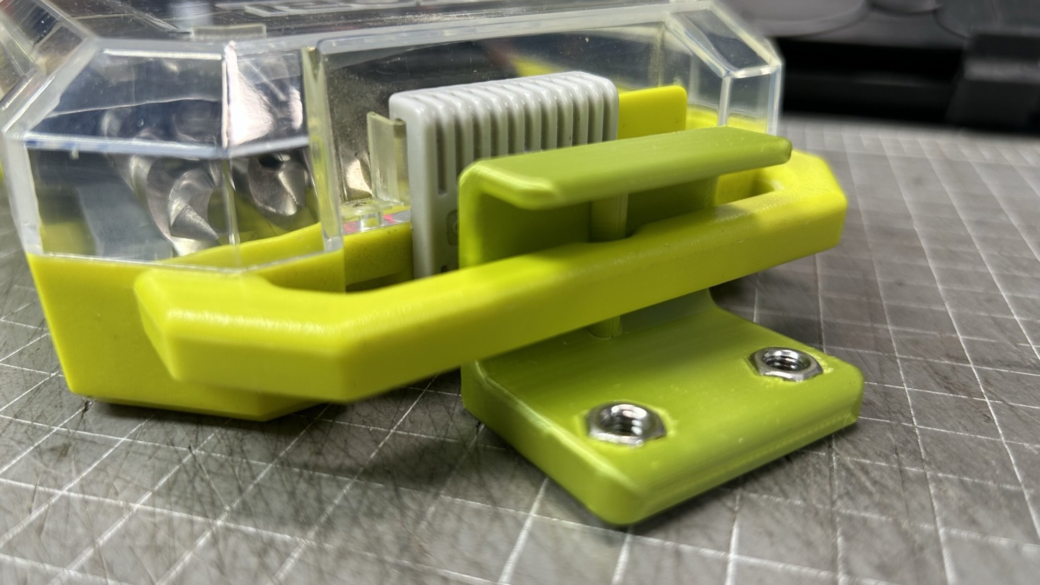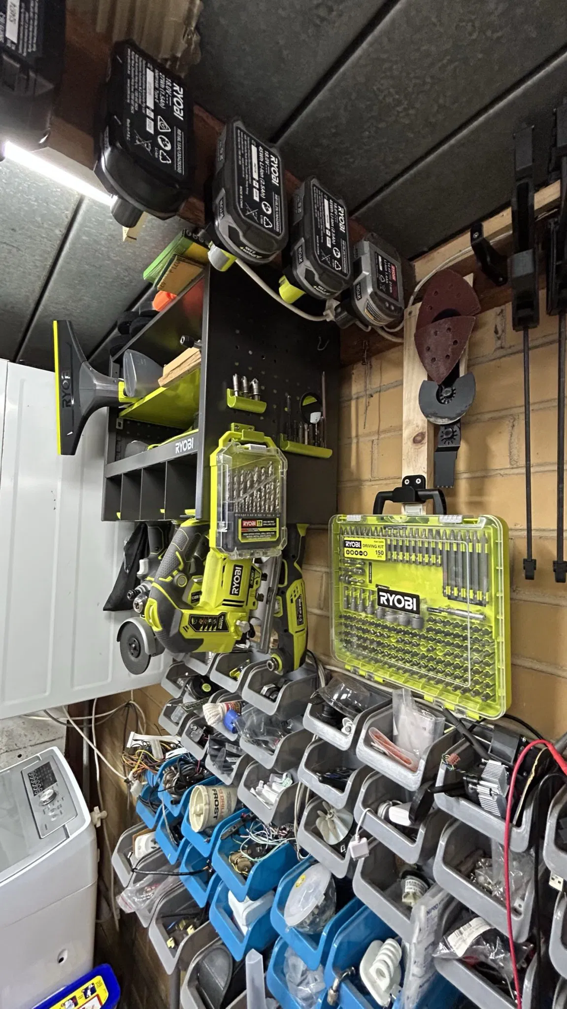 Các giá đỡ khác nhau để lưu trữ mũi khoan và mũi vít, mũi khoan countersink và bộ mũi khoan ở bên cạnh đơn vị lưu trữ Ryobi.