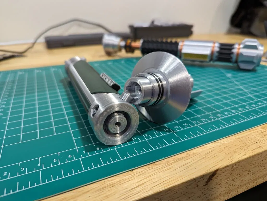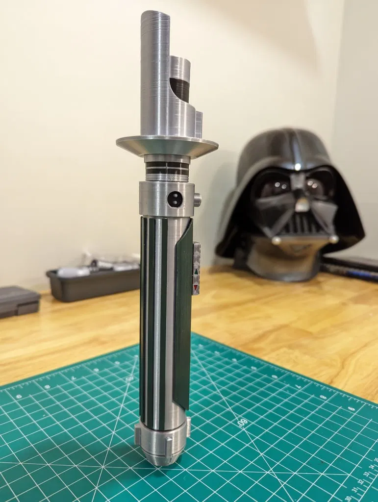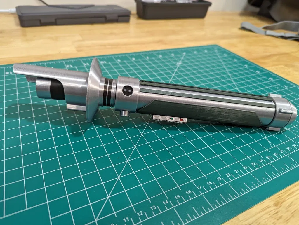 - Shroud Assembly-Emitter Tube-(black).stl Lưu ý khi lắp ráp- Sau khi bạn đã in tất cả các bộ phận của mình, hãy gắn hộp bộ kích hoạt vào tay cầm bộ kích hoạt trước (có một con vít để gắn nó), sau đó gắn tất cả các tay cầm vào thân kiếm TRƯỚC KHI bạn vặn nắp trên và chuôi vào. Các tay cầm được khóa vào thân kiếm khi nắp trên và chuôi được gắn vào. Các nút bên trên bộ kích hoạt rất mỏng manh nên tôi đã lắp chúng sau cùng. Khóa xoắn phần bảo vệ tay vào nắp trên của thân kiếm TRƯỚC KHI bạn gắn ống bọc. Điều này sẽ cho phép bạn căn chỉnh ống bọc và che đi các đường nối khi in. Để gắn bộ phát xạ/bảo vệ tay vào thân kiếm, bạn sẽ căn chỉnh các tab trong khóa xoắn, ấn mạnh cho đến khi nó vào vị trí, sau đó xoay 1/4 vòng để khóa nó vào. Bạn sẽ cần sử dụng một ít dầu dao/súng cho phần khóa xoắn ban đầu vì nó sẽ rất chặt – nhưng nó sẽ mượt mà sau một vài vòng xoay. Bộ phận ống bọc có một đai ốc khóa giữ cho ống bọc không bị dịch chuyển khỏi phần bảo vệ tay khi ngắt kết nối bộ phát xạ khỏi thân kiếm. Tôi đã thêm hai loại nắp chuôi khác nhau – một loại có D-Ring để treo vào thắt lưng của bạn... và một loại không có. In một hoặc cả hai... sự lựa chọn là của bạn. Tôi đã đính kèm rất nhiều hình ảnh lắp ráp và ảnh tham khảo mà lẽ ra sẽ làm cho mọi thứ trở nên dễ hiểu. Tôi hy vọng tất cả các bạn thích điều này và cho tôi biết nếu bạn có bất kỳ câu hỏi nào! ### Cài đặt in ấn Thương hiệu máy in: Voxelab Máy in: Aquila X2 Rafts: Không Supports: Có Độ phân giải: .012mm Infill: 20% Filament: SUNLU Silk PLA+ Bạc, Đen, Xám Thay đổi log ========== -100123 - đã thêm nắp chuôi và D-ring. -100223 - các vây trên Pommel-Pommel.stl được làm rộng hơn. -100523 - đã sửa lỗi ren dẫn trên ống phát xạ. Cảm ơn @jle2199 đã phát hiện ra nó! Danh mục: Đạo cụ