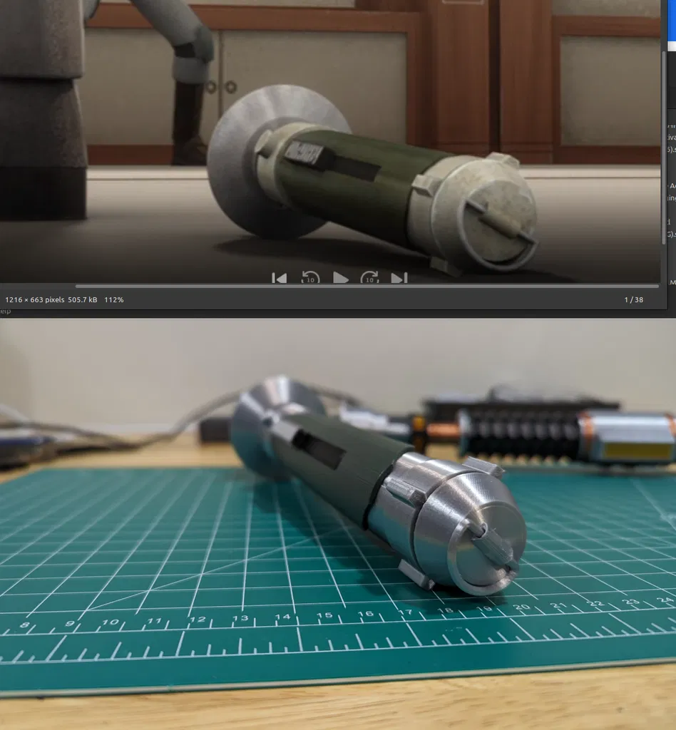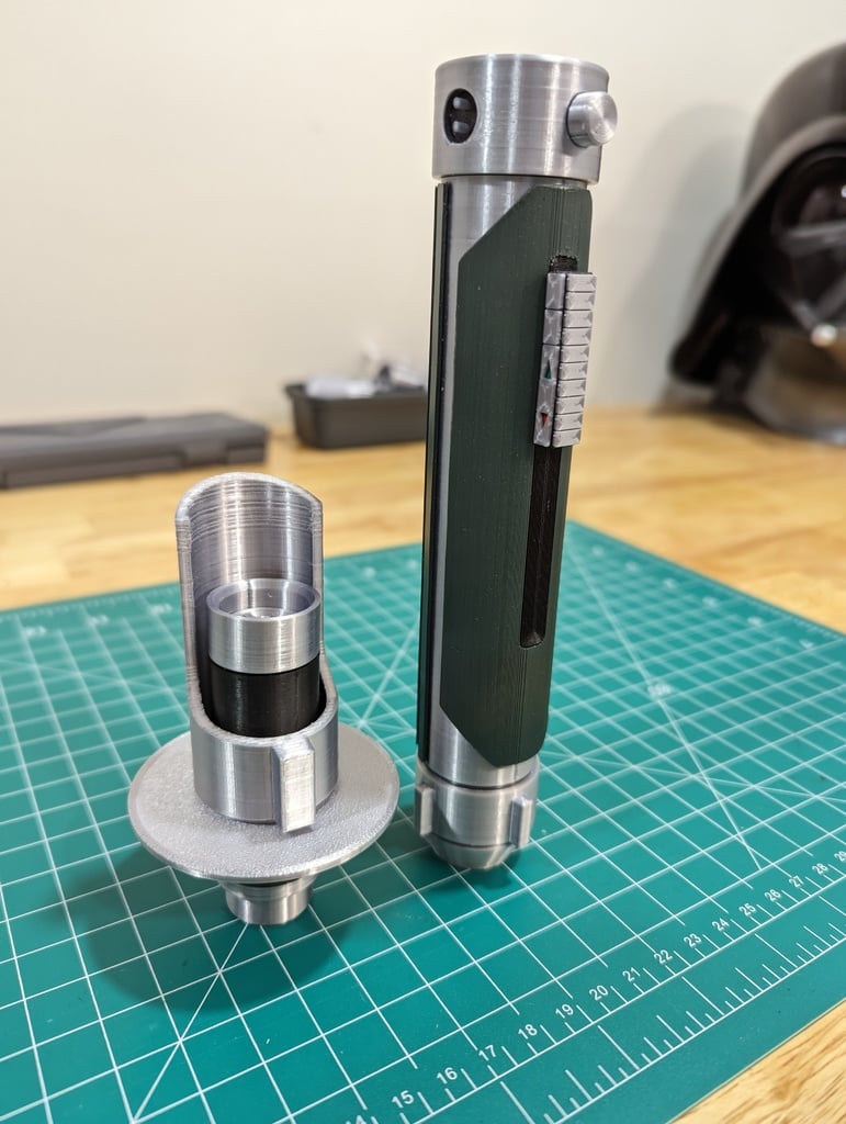 "">>>NHẤP VÀO ĐÂY ĐỂ ĐẾN PHIÊN BẢN CẬP NHẬT CỦA THANH KIẾM ÁNH SÁNG KANAN JARUS CỦA TÔI: Đây là phiên bản thanh kiếm ánh sáng của Kanan Jarrus theo cách nhìn của tôi. Có rất nhiều mẫu ngoài kia... nhưng tất cả đều thiếu một tính năng quan trọng. Kanan luôn tháo rời phần phát xạ để giấu thanh kiếm của mình – nên tôi phải có tính năng đó trên mô hình của mình! Vài lưu ý khi chế tạo thanh kiếm của tôi. Tôi đã làm mọi thứ với dung sai chặt chẽ, vì vậy hãy đảm bảo máy in của bạn được căn chỉnh tốt. Nên có giấy nhám và dao rọc giấy bên cạnh. Bạn cũng sẽ cần một tua vít đầu dẹt để gắn ống phát xạ vào phần vỏ bọc, và một ít dầu súng/dao cho phần khóa xoắn của bộ phát xạ. Tôi ghét keo dán. Tôi thường muốn nâng cấp các bộ phận trên bản in của mình và keo dán ngăn cản điều đó. Con trai tôi cũng có xu hướng làm hỏng đồ... có thể in lại bộ phận bị hỏng thay vì toàn bộ mô hình là một điểm cộng. Ngoại trừ các cổng sạc, không cần keo dán. Tất cả các tệp STL đều được định vị để che đi các đường nối nhiều nhất có thể (khi có thể). Các bộ phận của Bộ kích hoạt đều được in cùng nhau với việc đổi màu ở lớp thứ 9 (nếu in ở .12mm) để chuyển từ nút kim loại sang vỏ màu đen. Tôi đã đính kèm một bức ảnh về vỏ bộ kích hoạt với các phần được sơn màu đỏ và xanh lá cây sẽ được đóng khung bởi các nút mũi tên chỉ báo (tôi ghét việc sơn và đã làm cho nó dễ dàng nhất có thể). Tôi đã lấy một lon sơn Rust-oleum 2x màu xanh lá cây từ Home Depot cho các bộ phận cầm nắm – nó gần giống với những gì bạn thấy trên thanh kiếm của Kanan trong Rebels. Các chốt cổng sạc chỉ đơn giản là sợi nhựa được cắt theo kích thước và dán siêu dính vào bộ phận chèn cổng sạc. Tôi đã dùng một ít keo dạng thỏi trên bộ phận chèn cổng sạc để có thể tháo ra nếu cần. Tôi đã in mọi thứ bằng SUNLU Silk PLA+ ở .12mm với độền 20% (đủ chắc chắn), đầu nóng 215 độ, bàn nhiệt 60 độ. Tôi đã sử dụng cài đặt 'Chất lượng siêu cao' trong CURA chủ yếu để có chất lượng ren tốt hơn trên các vít. Các tệp STL đã được ghi chú nếu bạn cần in nhiều hơn một bản. Tôi cũng ghi chú các bộ phận màu đen (mọi thứ khác sẽ có màu bạc ngoại trừ các bộ phận cầm nắm). Bạn sẽ cần giá đỡ cho các bộ phận sau: -Activator Assembly-Activator.stl