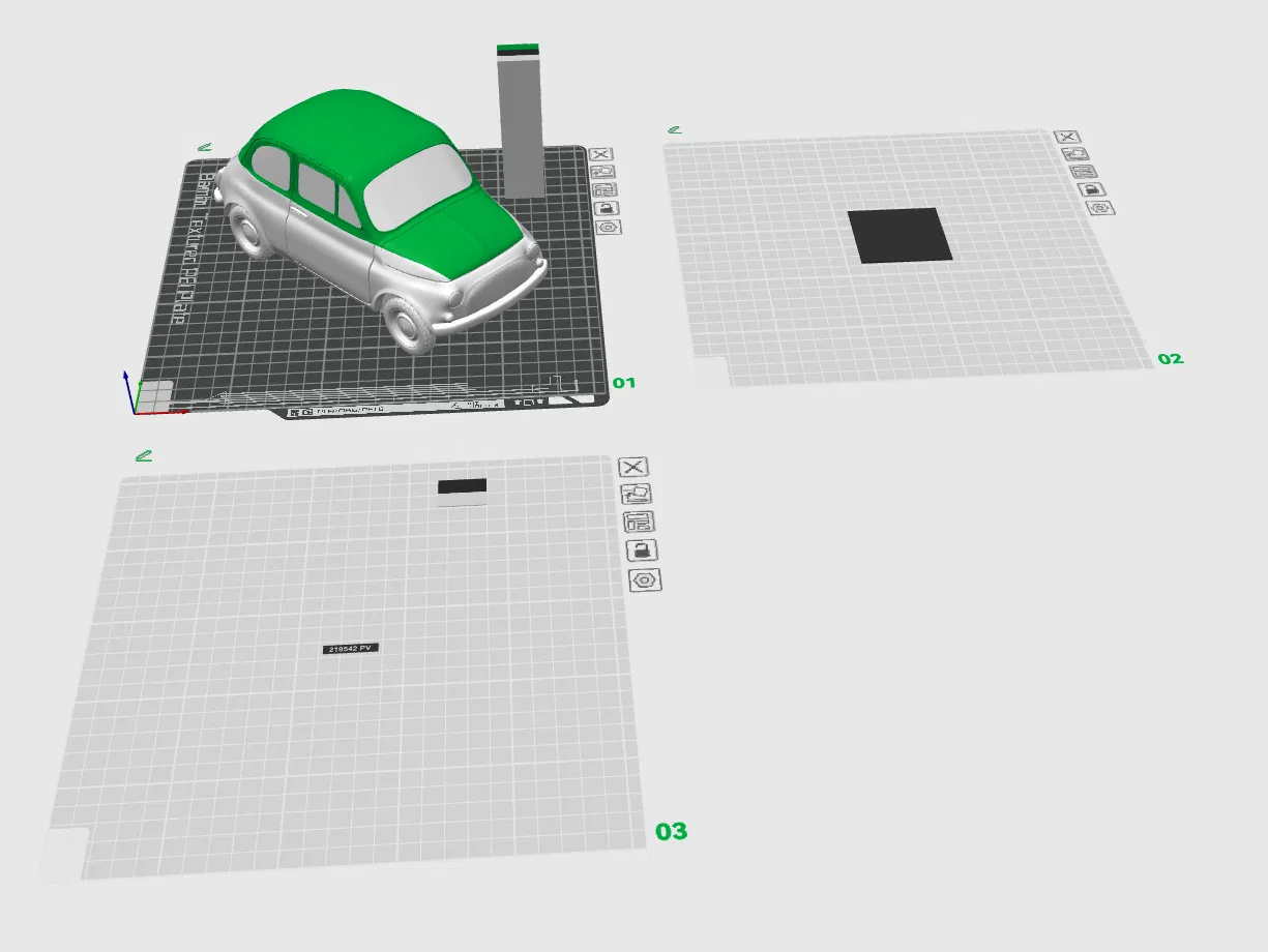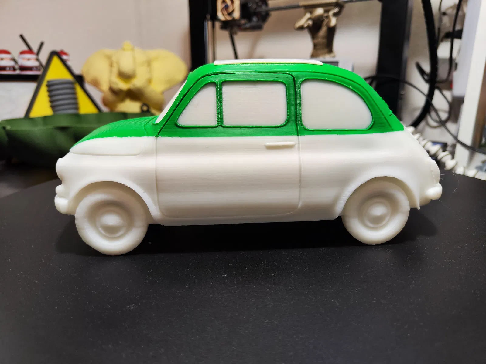 Chiếc xe Fiat 500 cổ điển của Ý, được scan và tô màu chi tiết. Mô hình có chiều dài 20cm, với các bộ phận như mui xe và biển số có thể lắp rời. Hướng dẫn in chi tiết cho P1S và AMS bằng cấu trúc hỗ trợ dạng cây, lớp 0.20, 4 lớp tường và 5% độ dày ruột Giroid.