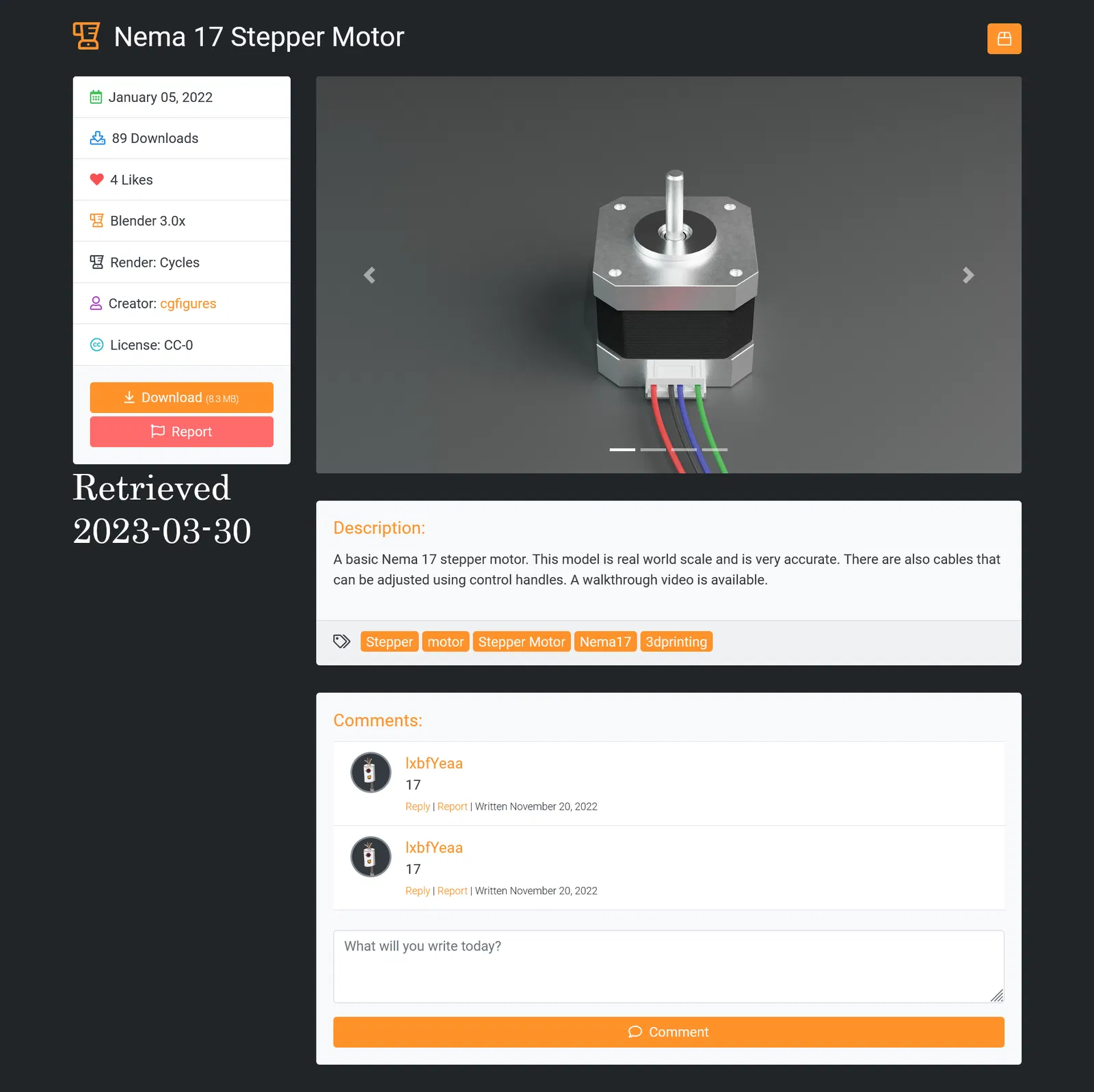 Mô hình động cơ bước Nema 17 Miễn phí bản quyền (Public domain). Được tạo bởi cgfigures và ban đầu tải lên Blend Swap. Thích hợp cho các dự án in 3D hoặc mô phỏng cơ khí.