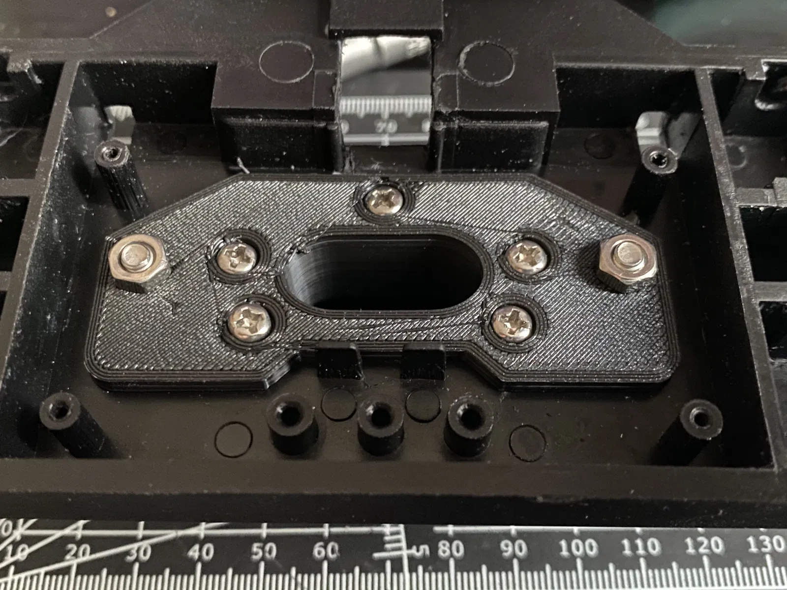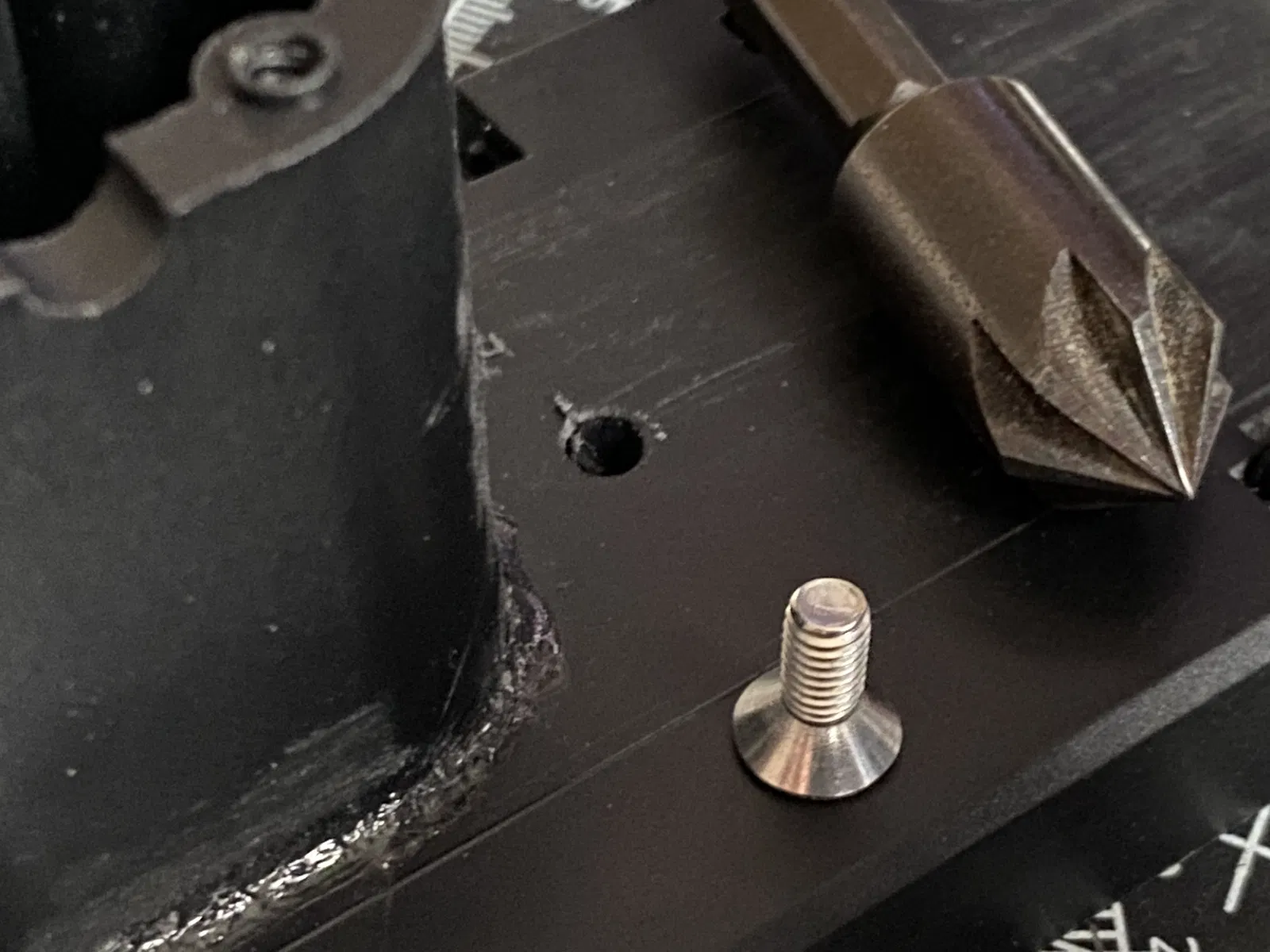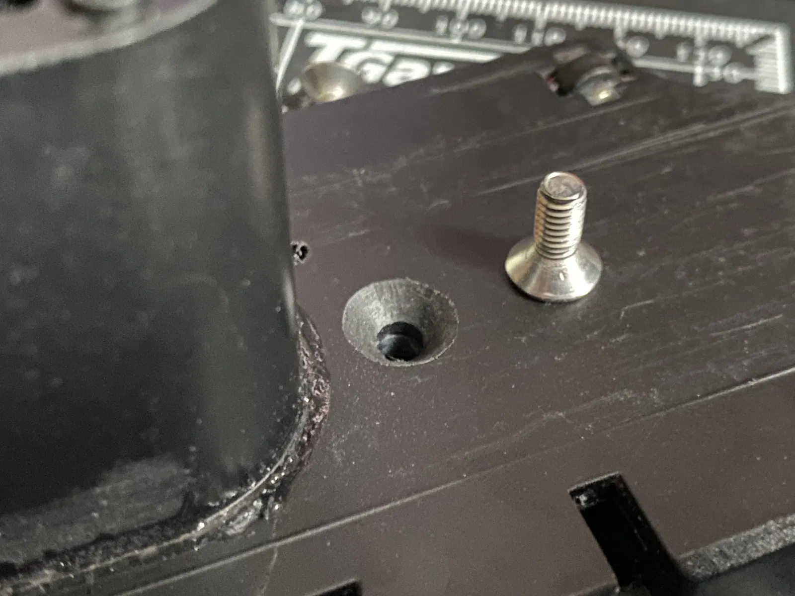 - Để chắc ăn hơn nữa, anh em có thể bắt bộ phận sửa chữa vào đế bằng đai ốc và bu lông M4. Để làm điều này, hãy dùng 2 lỗ còn lại làm khuôn và khoan bằng mũi khoan 4mm. Sau đó, từ phía trên, dùng mũi khoét lõm để đầu bu lông chìm xuống bằng với mặt đế.