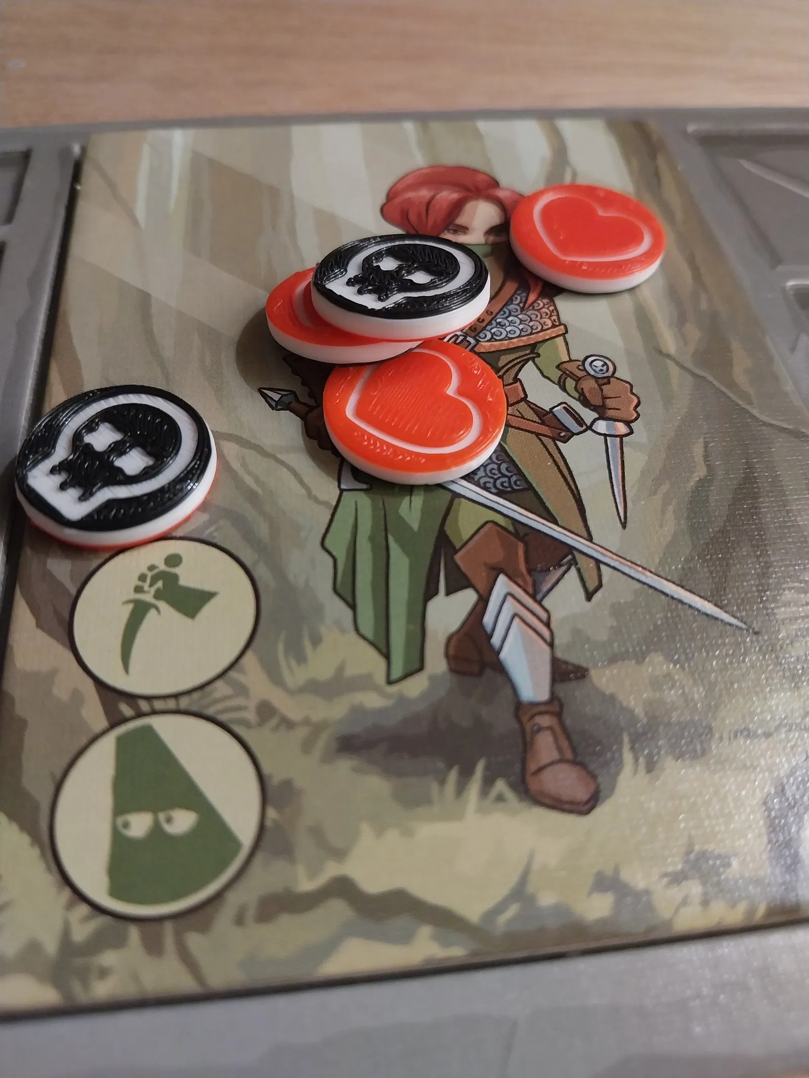 Token hình trái tim và đầu lâu dùng để đại diện cho mạng của người chơi trong bàn cờ Karak. Có thể in đa sắc hoặc đơn sắc, với các tùy chỉnh về màu sắc và kỹ thuật in để tối ưu hiển thị.