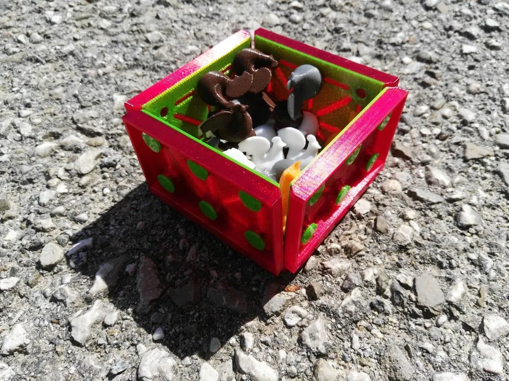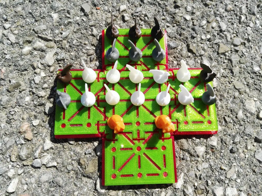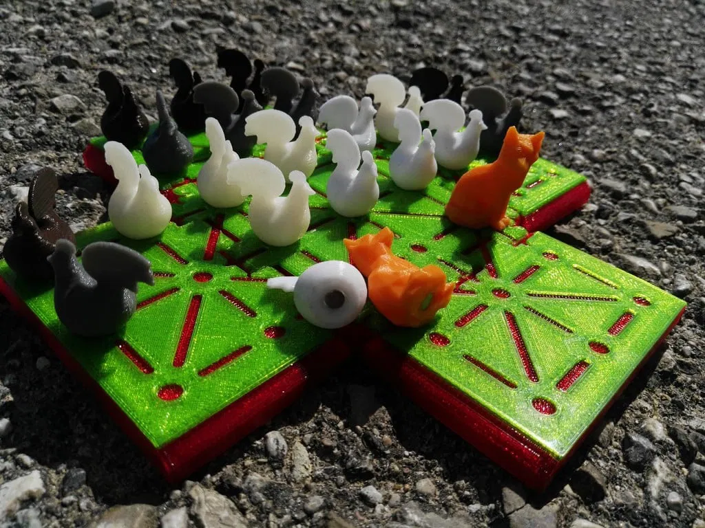 Bộ đồ chơi Cáo & Gà dành cho 2 người, gồm 20 con gà và 2 con cáo. Bản in 3D bao gồm các bộ phận bàn cờ và quân cờ, yêu cầu nam châm để chơi. Hướng dẫn in và luật chơi chi tiết được cung cấp.