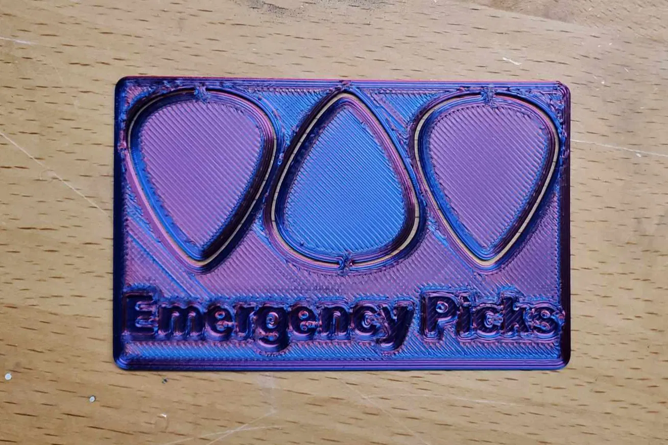 Miếng gảy đàn guitar dự phòng cho những lúc "khẩn cấp". Hoàn hảo để tận dụng phần cuối của cuộn dây nhựa in 3D. Thẻ có kích thước bằng thẻ tín dụng, vừa vặn trong ví, còn các miếng gảy thì có kích thước tiêu chuẩn.