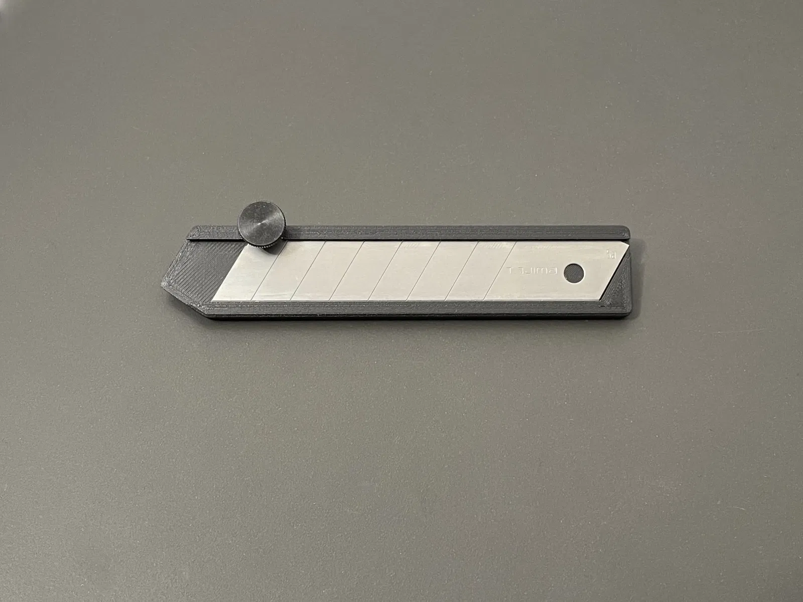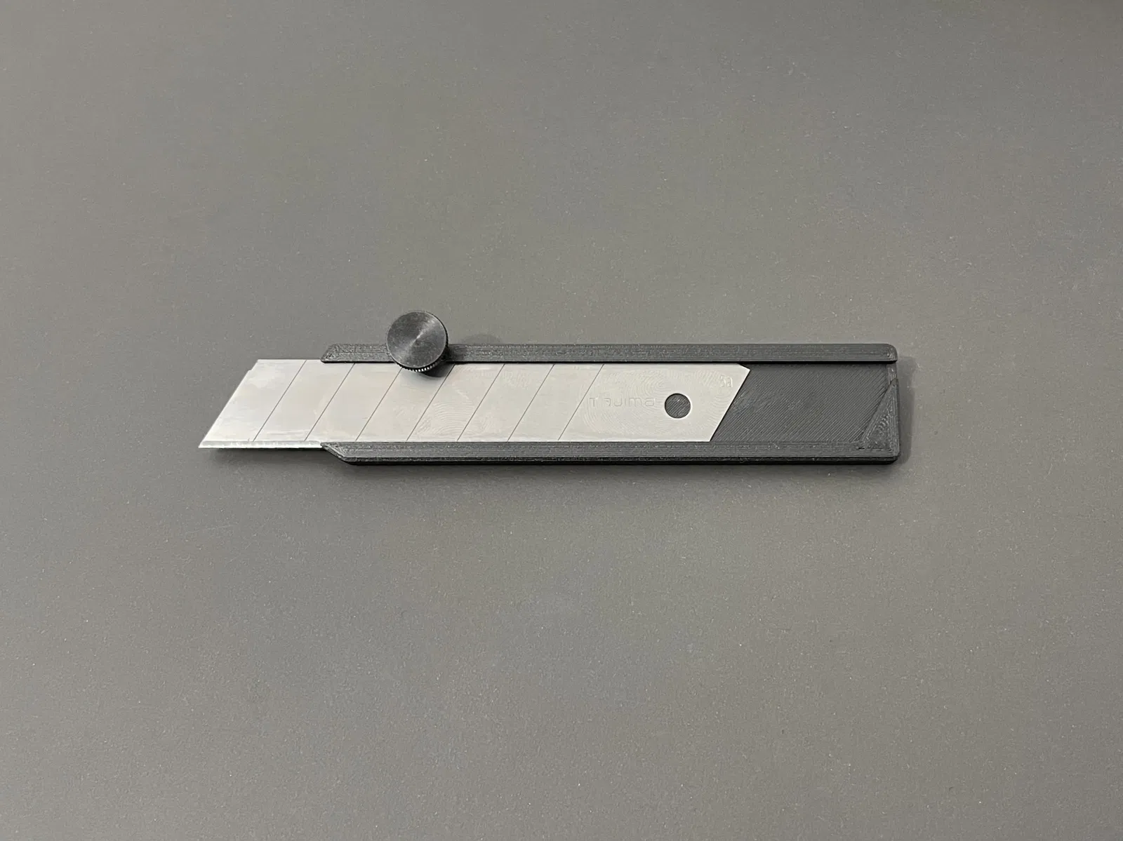 Đây là mẫu tay cầm dao cắt đa năng, dùng lưỡi dao 18mm. Cần ốc vặn tay, vòng đệm và ốc ren nhiệt. In bằng PETG hoặc PC, chú ý độ bám dính lớp để tránh gãy phần dẫn lưỡi. Cẩn thận khi dùng dao nhé!