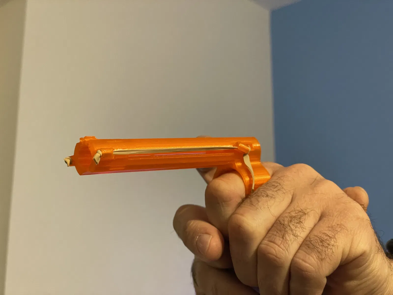 - Dùng dây thun loại mạnh buộc phần đầu nòng súng vào rãnh trượt, đây là cách bạn chỉnh lực bắn, mình đã dùng (15mm) cho mẫu thử nghiệm