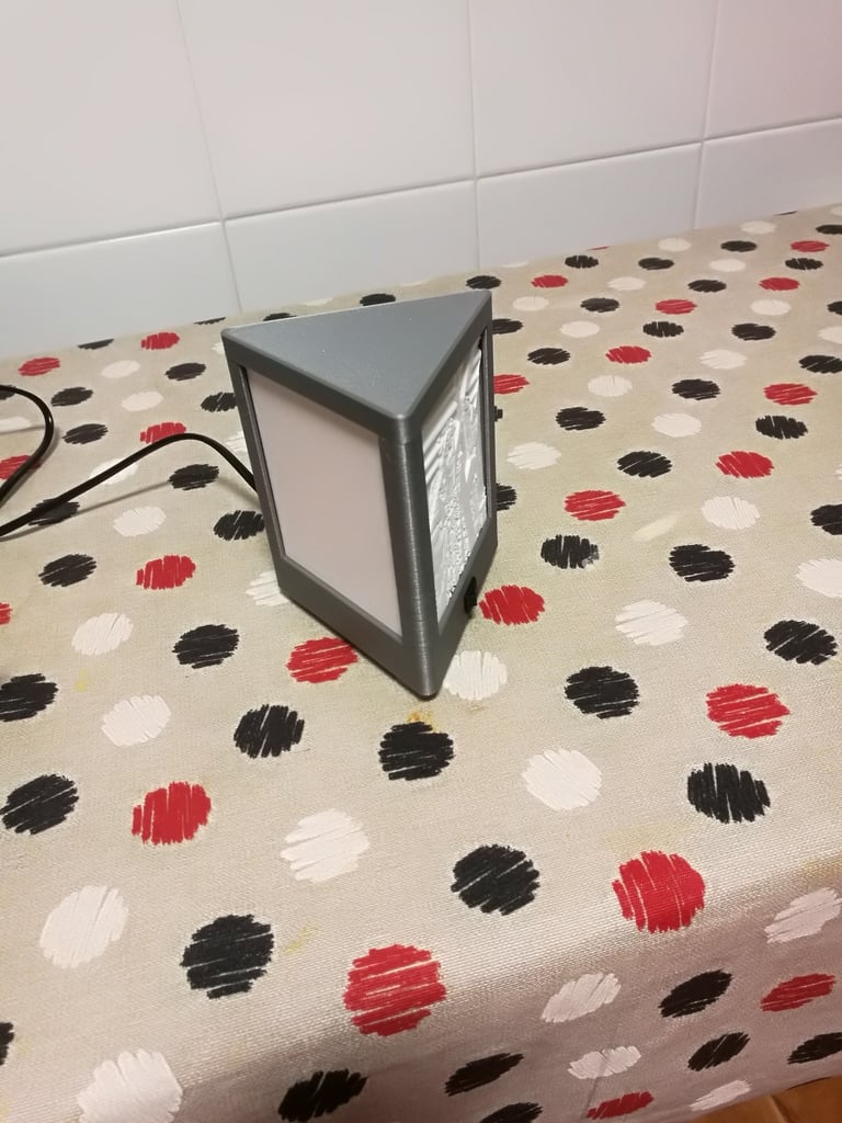 Mô hình chao đèn litofania hình tam giác này được làm từ 3 phần: thân, nắp và chân. Nó phù hợp cho 1, 2, hoặc 3 litofania có kích thước 100x90mm. Đã cập nhật cách lắp ráp nắp và thân bằng ốc M3x12. Sử dụng bóng đèn LED E14.