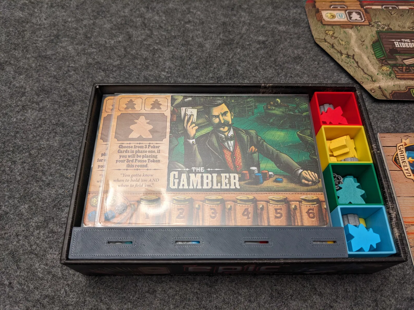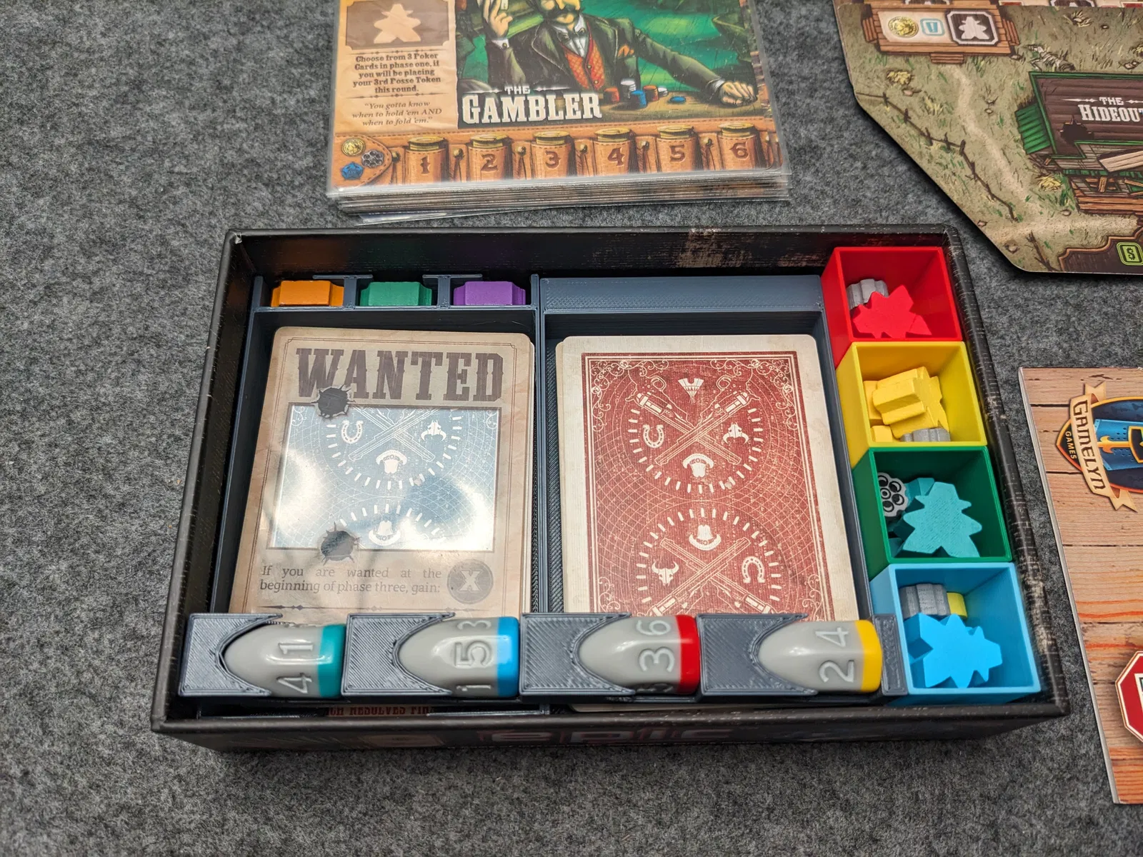 Tui tự làm hộp đựng Tiny Epic Western vì không tìm được cái nào ưng ý. Thiết kế này đảm bảo mọi thứ vừa khít hộp, quân mỗi người chơi trong hộp riêng, và quan trọng là chứa được cả bài có bọc protector. Các bộ phận in ấn dễ dàng, không cần support.
