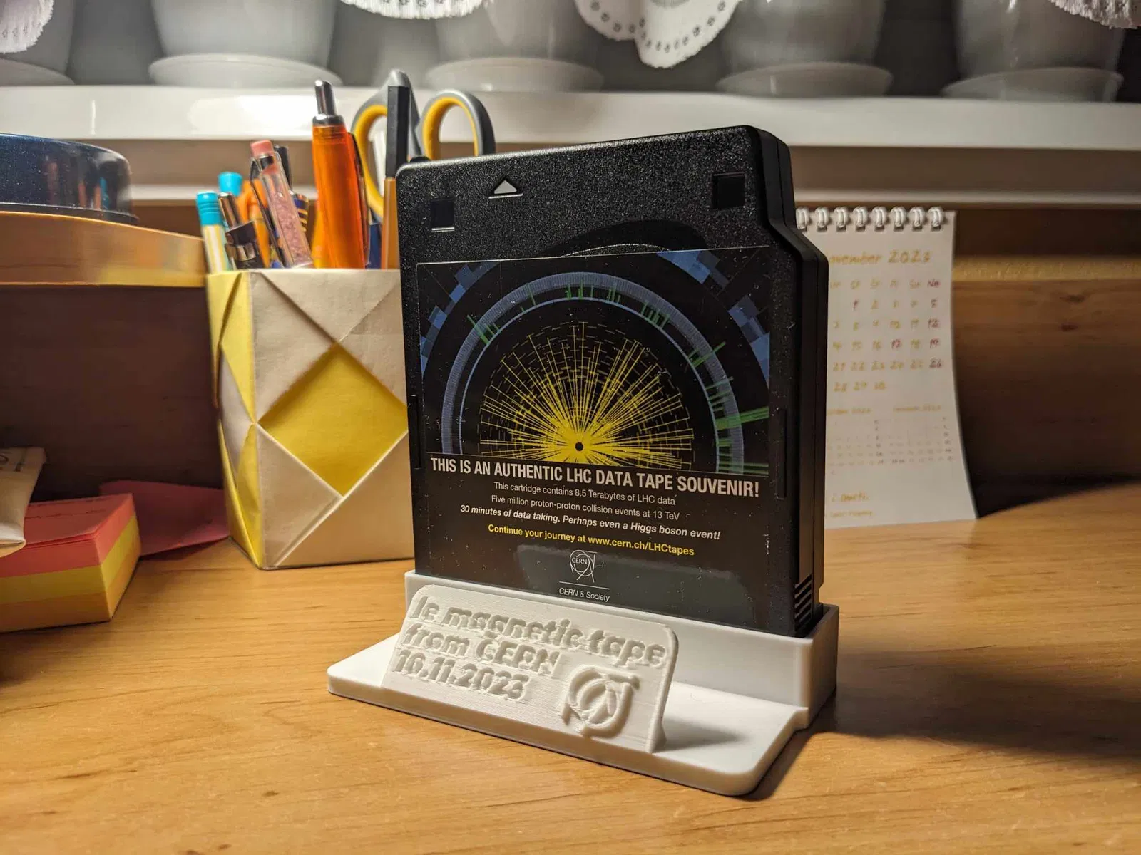 Cái đế đơn giản này dành cho cuộn băng từ CERN LHC xịn sò mà bạn có thể mua ở cửa hàng quà tặng CERN Science Gateway làm kỷ niệm :D. Một số cuộn băng có thể chứa dữ liệu về boson Higgs (ngầu bá cháy luôn ha).