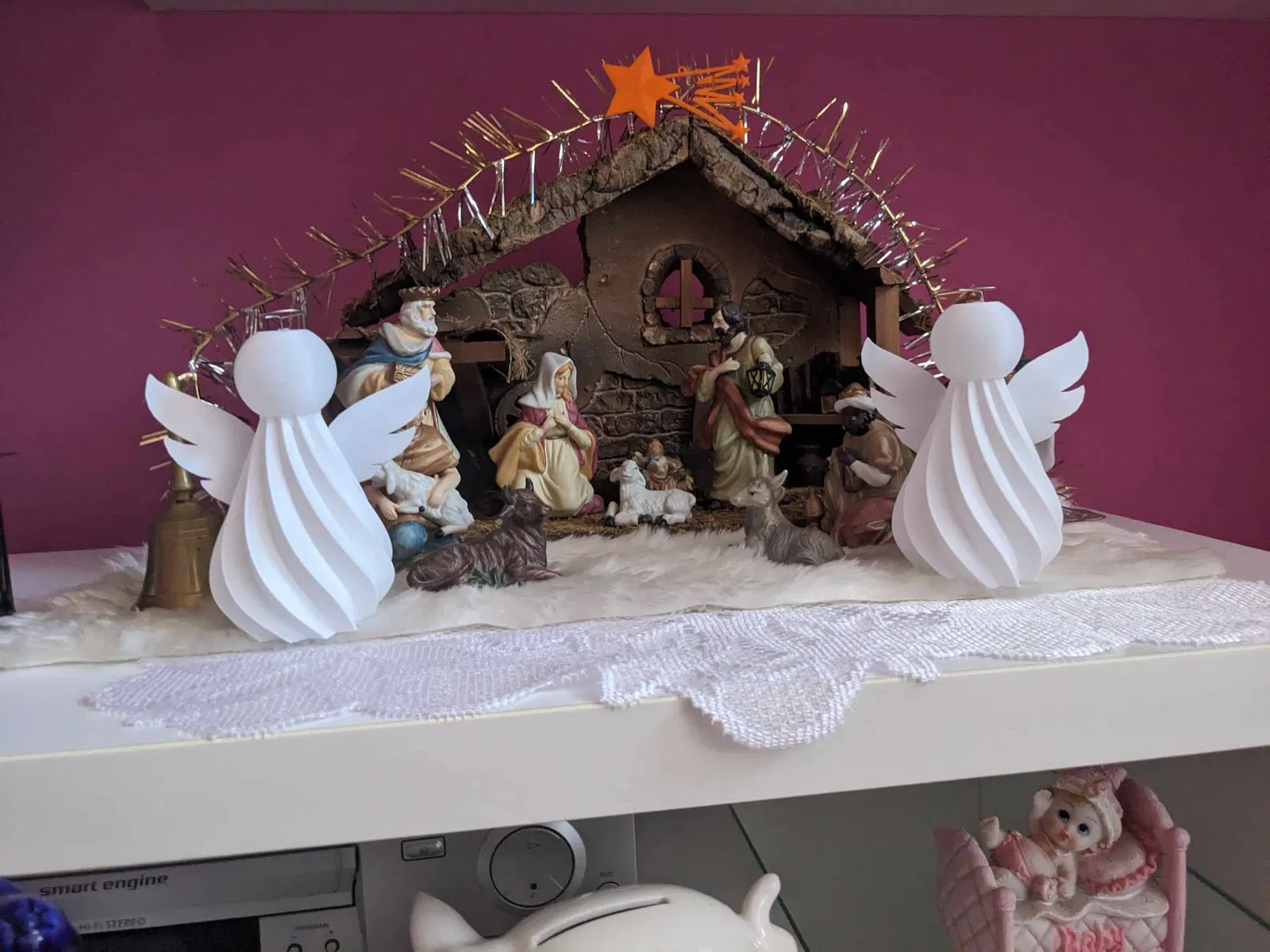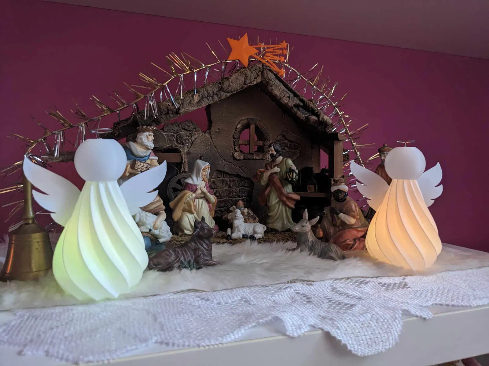Mô hình thiên thần nhỏ, là bản phối lại từ cây thông Noel, có lỗ dưới đáy để đặt nến LED tealight. Phần váy in chế độ vase, đầu và cánh in thông thường. Thích hợp làm đồ trang trí Giáng Sinh.
