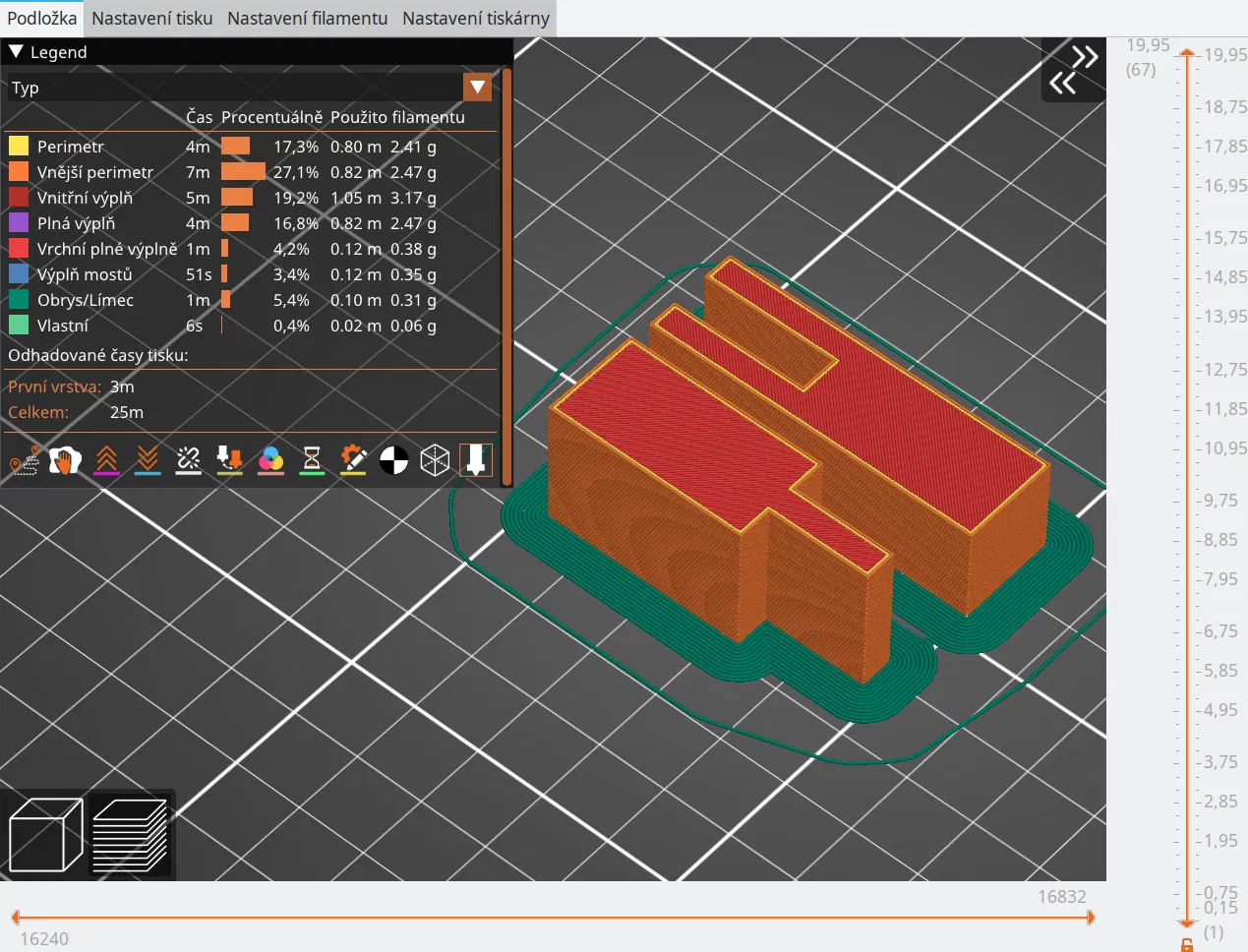 Đầu phun: 0,4 mm Chiều cao lớp: 0,3 mm Chu vi: 2 Điền: Lưới, 15% Vật liệu: PLA