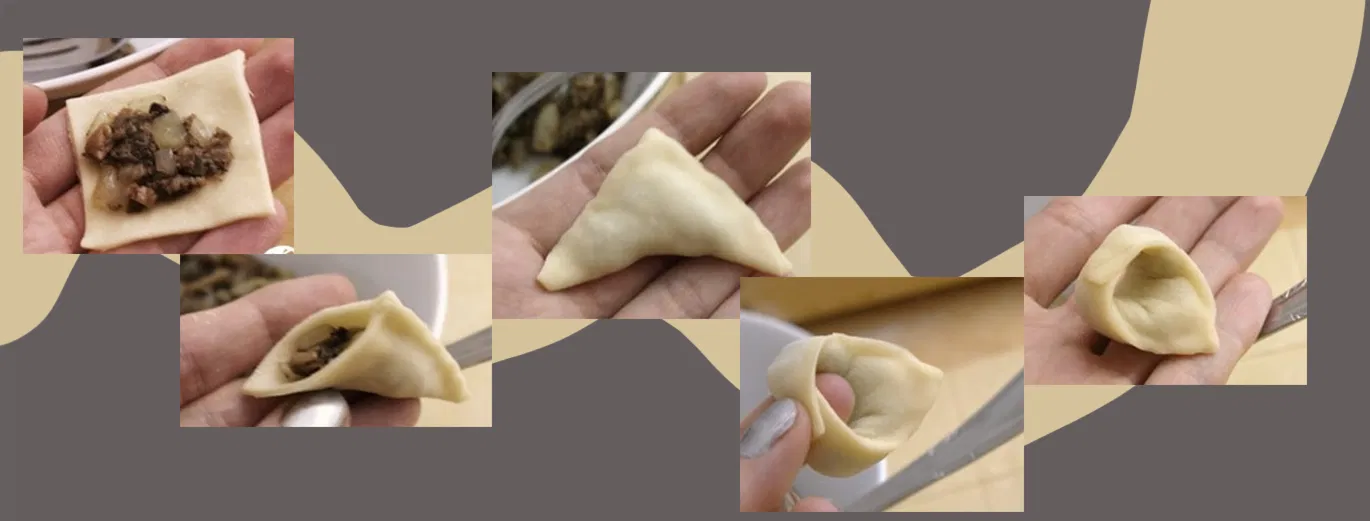 Làm 4 cái Uszka (tai) cho món súp борщ của bạn cùng một lúc, cứ đóng dấu liên tục cho đến khi nào bạn làm xong hết thì thôi. Dễ ẹc à.