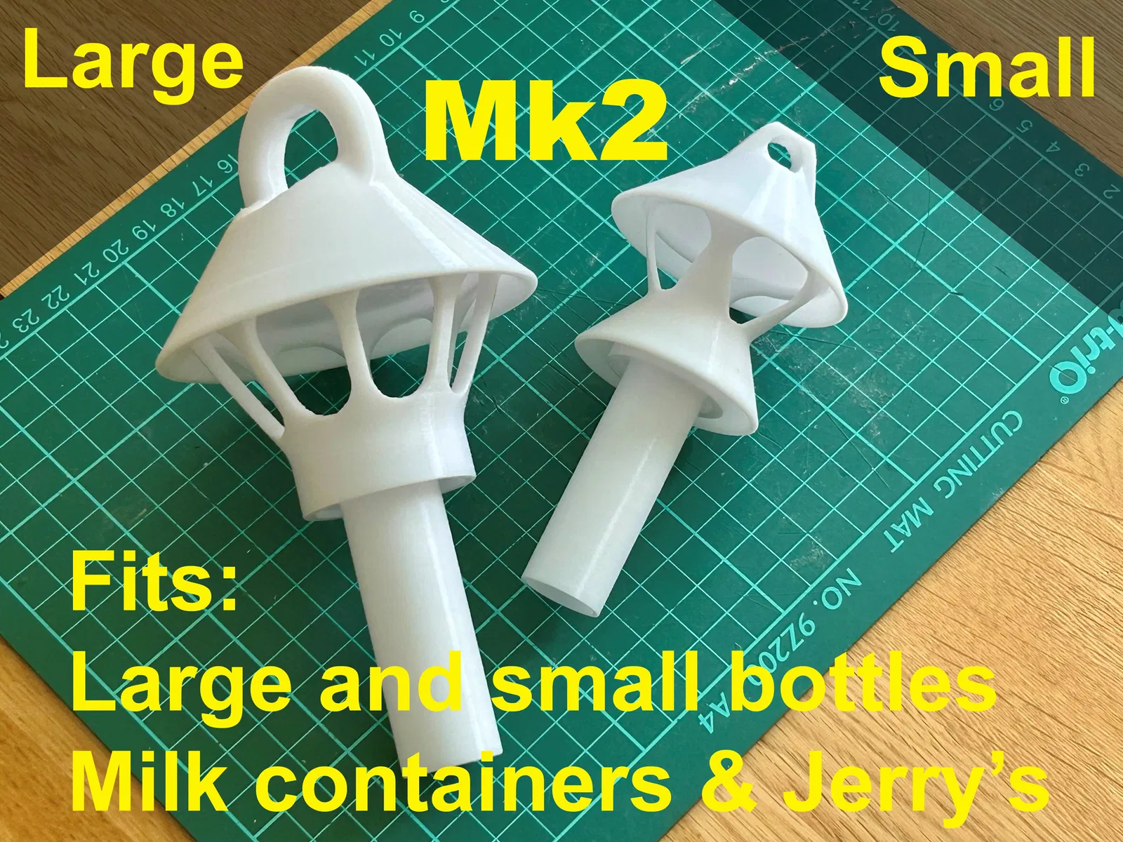 Bộ phụ kiện bẫy ong bắp cày và tò vò, tái sử dụng chai nước, sữa hoặc can xăng. Thiết kế lại để bắt cả hai loại côn trùng, có mui chống mưa và sàn đáp. In bằng PETG màu xanh lá cây hoặc trắng. Thông số kỹ thuật vật chứa và mồi nhử chi tiết.