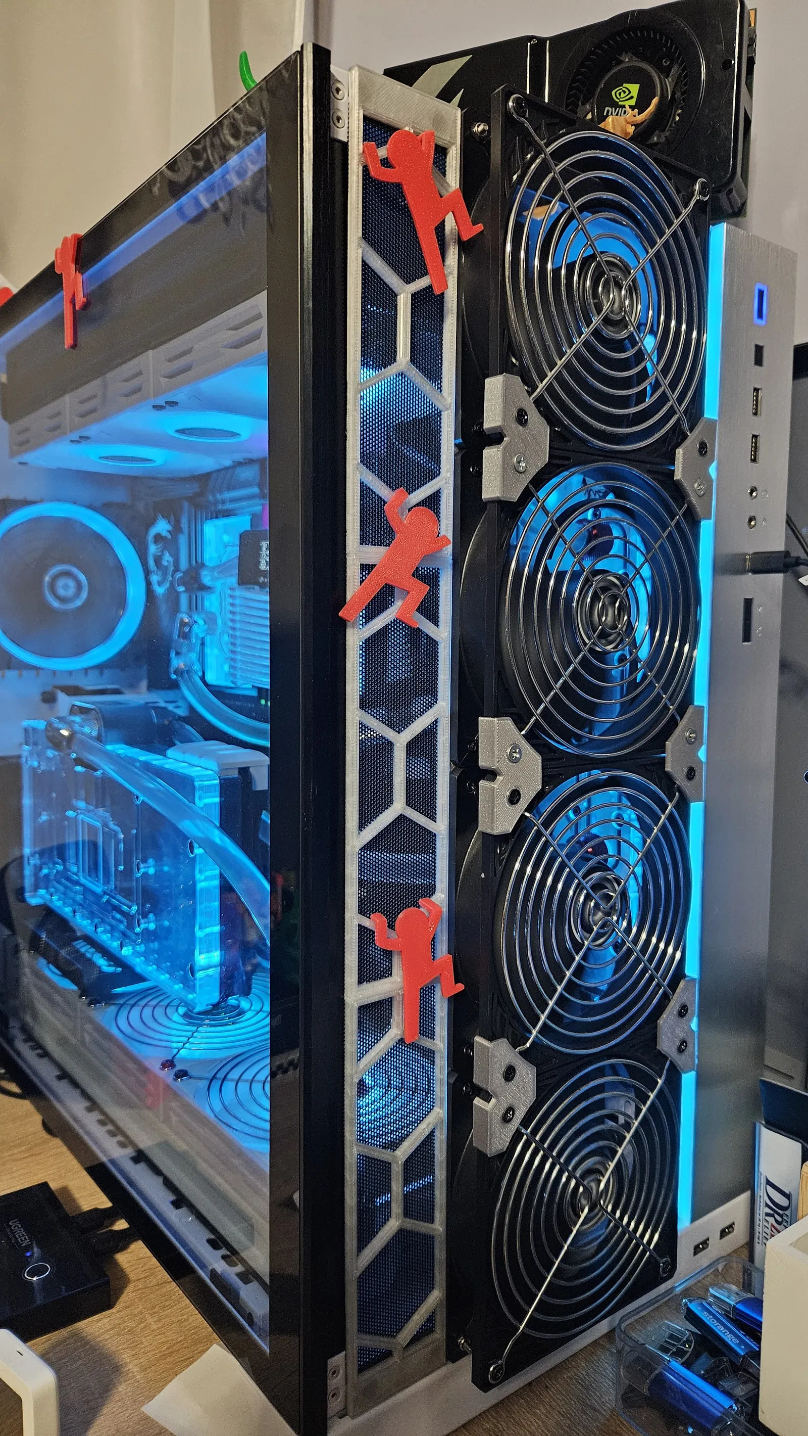 Thay thế mặt kính phía trước của thùng máy Lian Li O11 Dynamic XL bằng lưới lọc bụi. Bộ lọc gồm 3 phần, gắn bằng nam châm, có thể tùy chỉnh vị trí lắp đặt. Lưới lọc này giúp cải thiện khả năng lọc bụi và thông gió cho hệ thống.