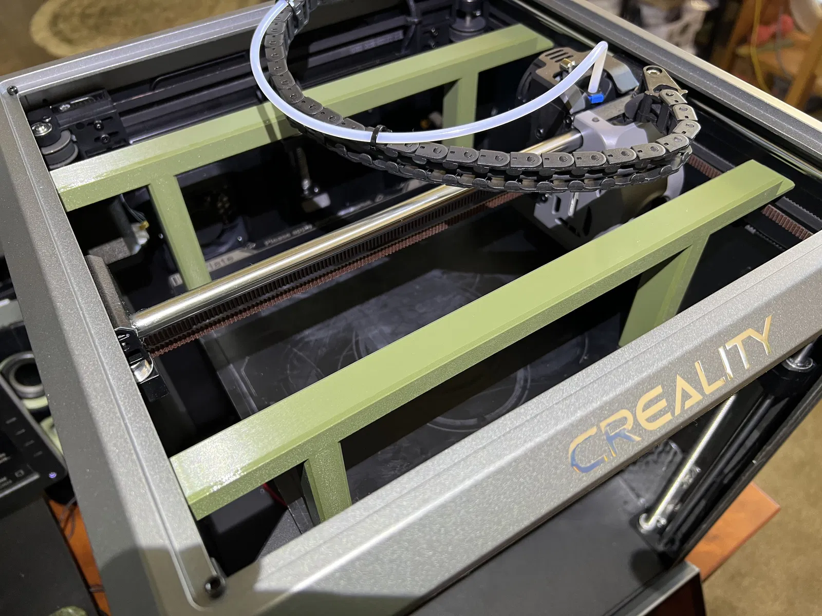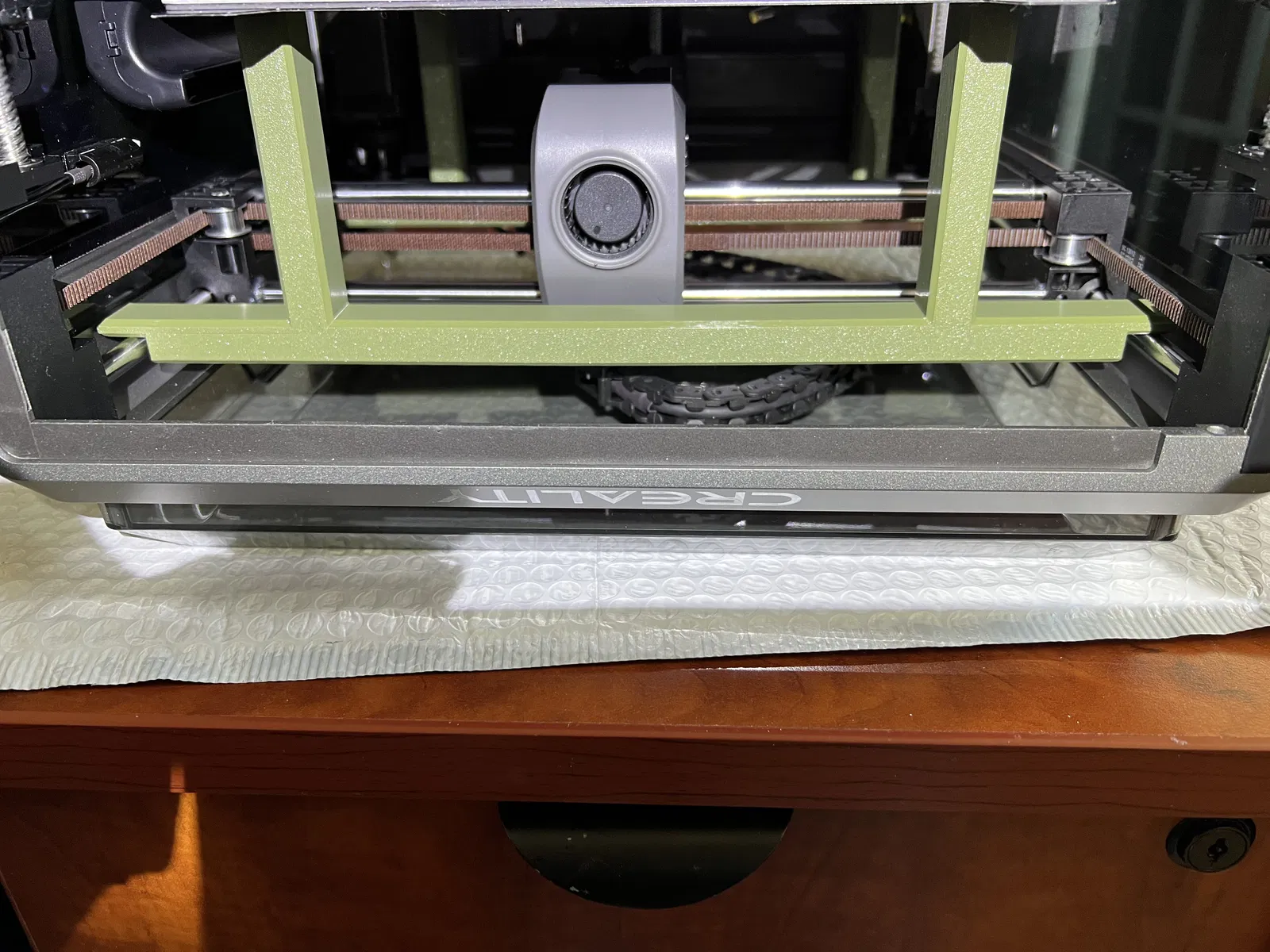 Tôi có đính kèm một vài ảnh tôi chụp bộ phận gá này. Bạn sẽ thấy có hai cái. Một cái đặt ở phía sau bàn và một cái ở phía trước. Chúng trượt dưới hai thanh trục Y ở mỗi bên và trải dài theo chiều dọc từ đó xuống bề mặt bàn. Chiều cao của các bộ phận gá này đủ dài để đảm bảo đầu phun không chạm vào bề mặt bàn trong quá trình cân thủ công.