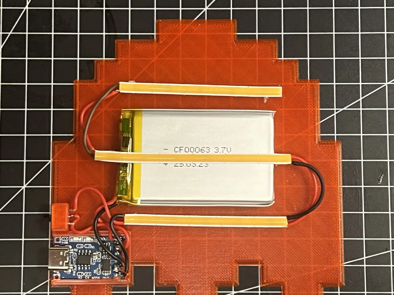 Phiên bản sửa đổi từ mẫu ma Pac Man của tksgeo, có thêm chỗ gắn bộ sạc pin LiPo TP4056 và công tắc nhỏ. Thiết kế có thể tùy chỉnh kích thước, có thêm mắt thẳng và cần in đủ 5 bộ phận.